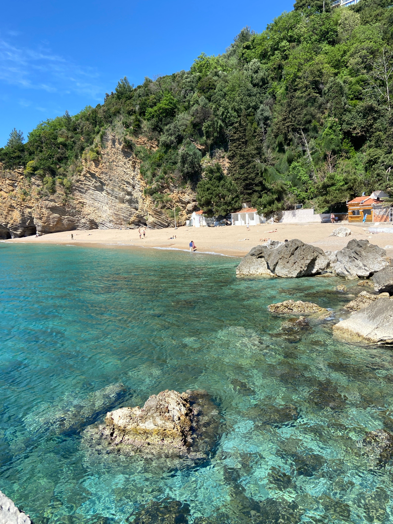 This aerial view captures a picturesque beach cove in Budva, Montenegro, under a clear blue sky. The scene is dominated by the vibrant turquoise and emerald hues of the shallow, crystal-clear sea, rev…read more