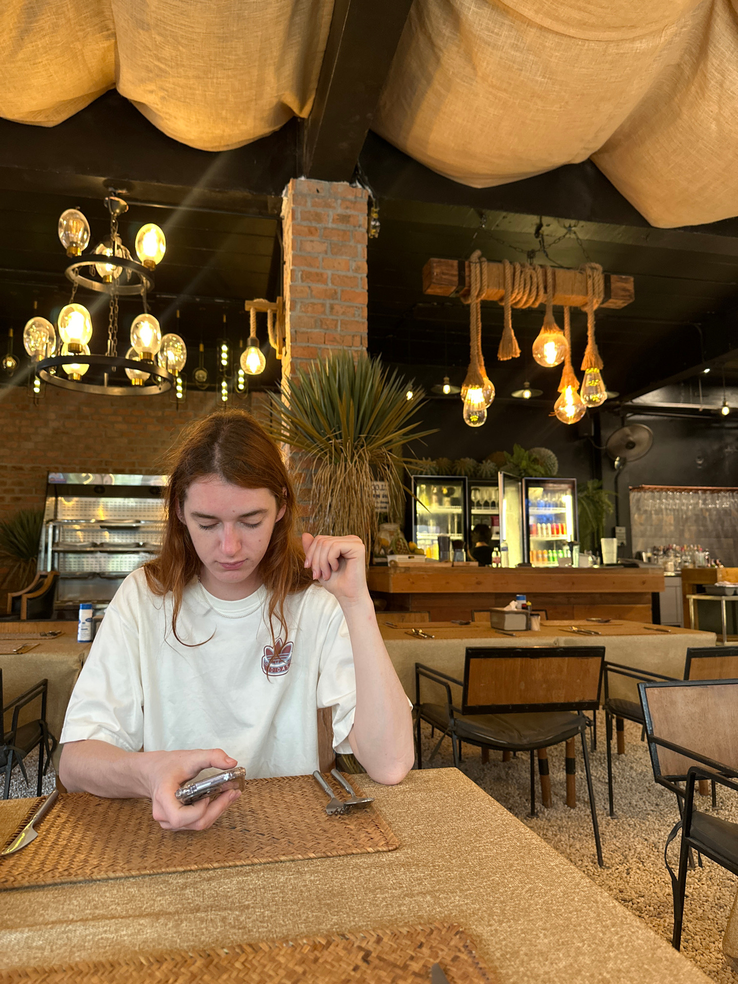 A vertical, eye-level shot shows a person seated at a table in what appears to be a restaurant or cafe in Baan Chaweng, Thailand. The person, likely a young adult with medium-length, reddish-brown hai…read more
