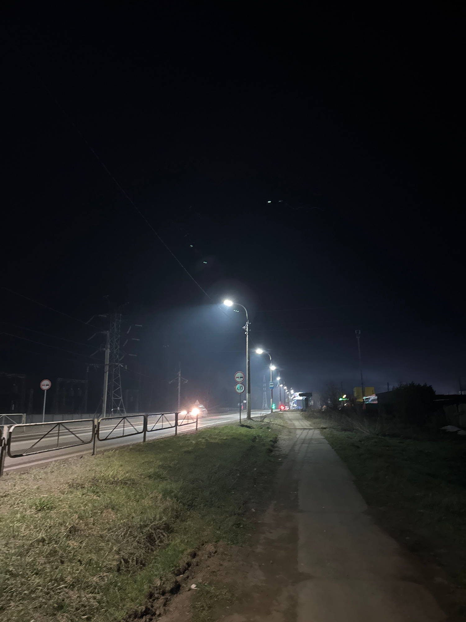 This is an outdoor nighttime scene in Chaikovsky, Russia. The view is along a pathway or sidewalk running parallel to a road with streetlights. Grass and possibly other vegetation line the pathway's e…read more
