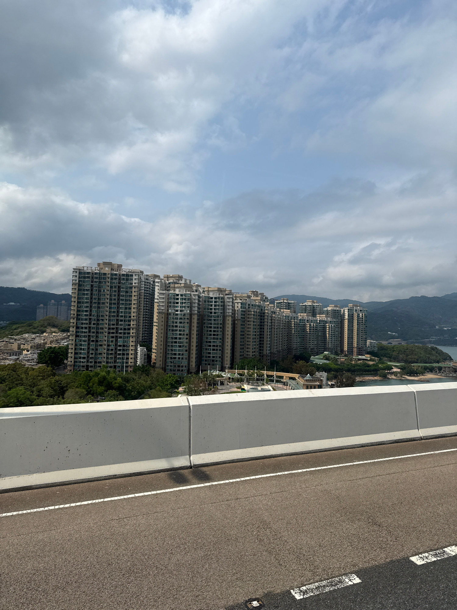 The image shows a view from a high vantage point in Hong Kong, China. A concrete barrier runs along the right side of the frame, adjacent to an asphalt road with white lane markings. Beyond the barrie…read more