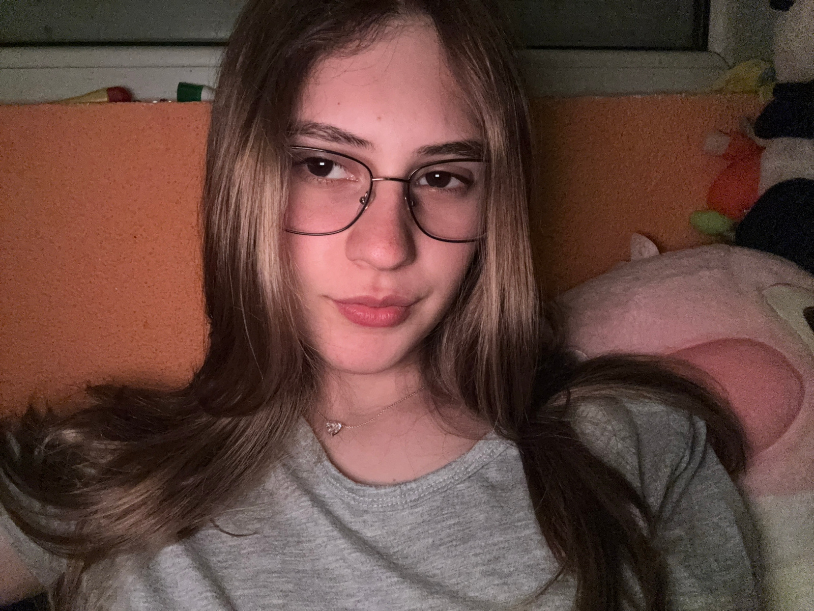 An upside-down portrait captures a young individual, likely female, lying down and looking directly into the camera. She has long, light brown hair that frames her face, and is wearing wire-rimmed gla…read more