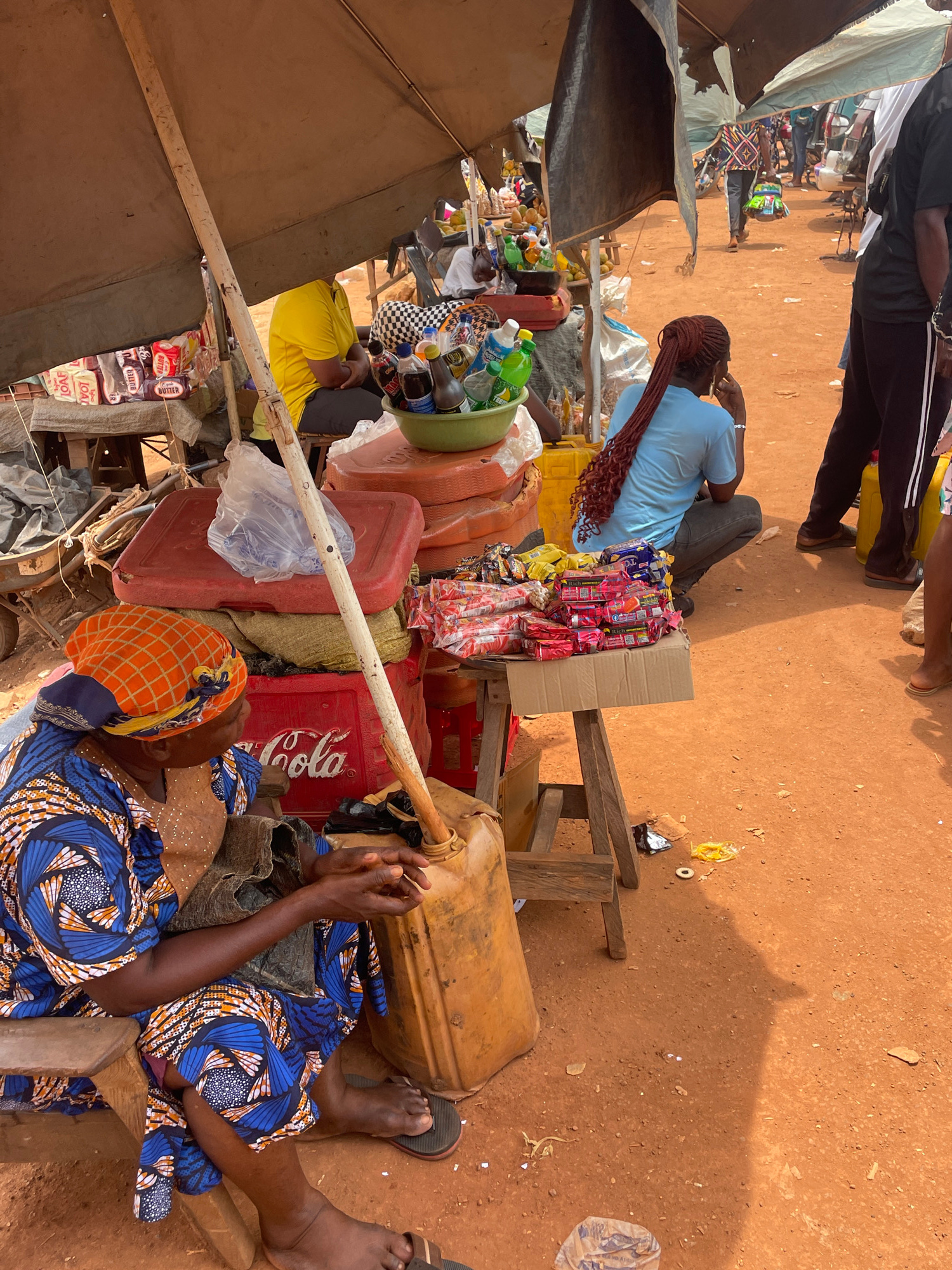 The scene is a market in Markurdi, Nigeria. Two vendors are visible. One vendor, wearing a blue shirt and long braided hair, sits near a display of packaged snacks. Another vendor, dressed in a blue a…read more