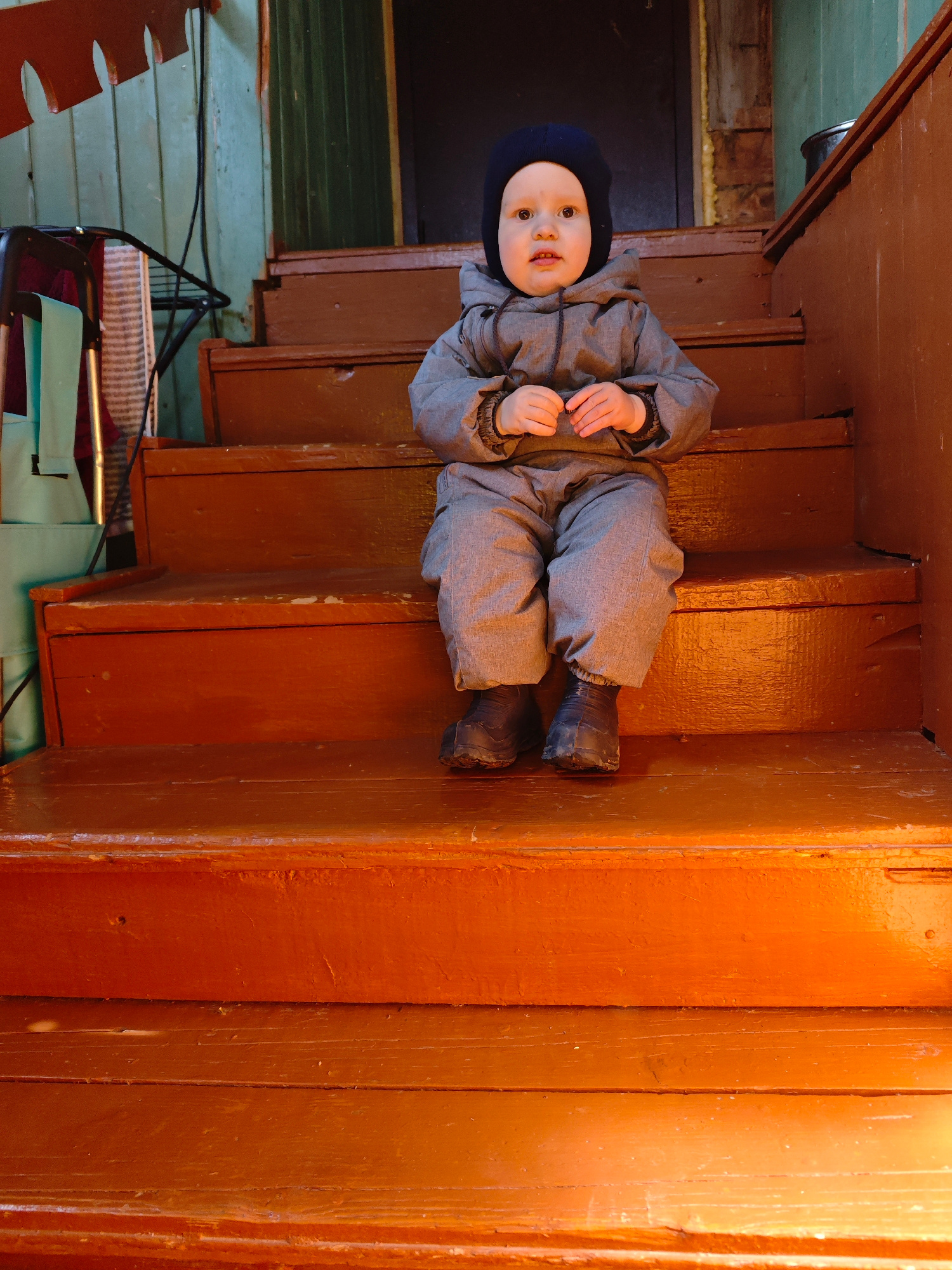 A young child, likely a toddler, is depicted sitting on a wooden staircase in Фоки, Russia. The child is positioned on the third step from the bottom, looking directly towards the viewer with a calm,…read more