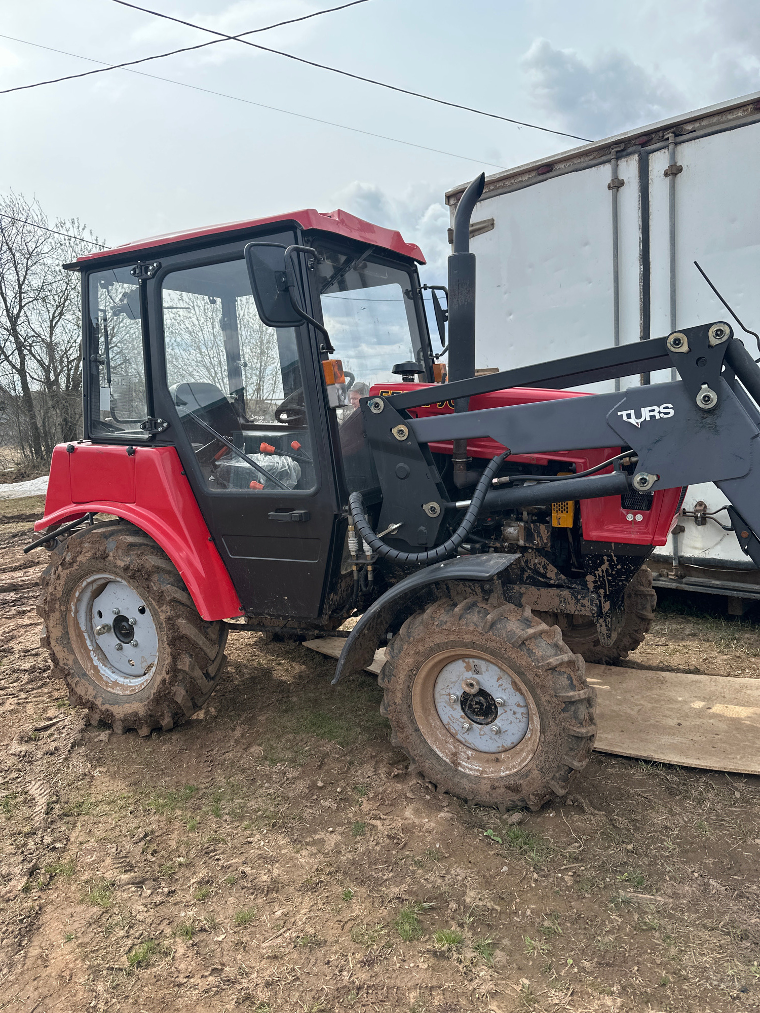 The image depicts a red tractor with a black loader arm labeled "TURS" partially adjacent to a white trailer. The tractor's wheels are muddy, suggesting recent use in wet conditions. The ground is mud…read more