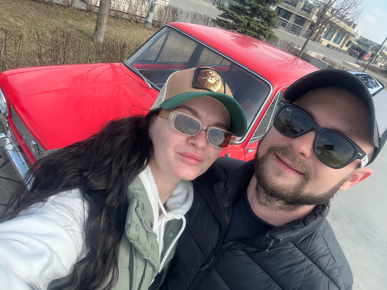 A man and a woman are positioned closely together, seemingly lying on top of a red vintage car. The man is wearing sunglasses and a baseball cap, along with a black puffy jacket. He has a beard. The w…read more