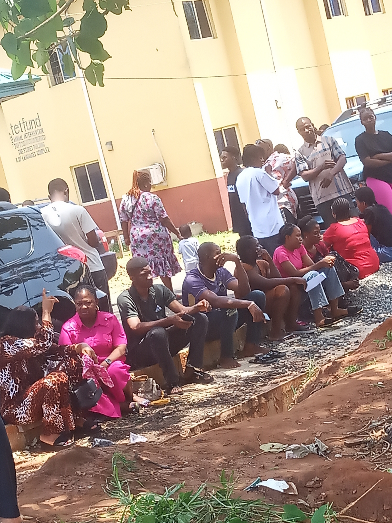 The image shows a group of people gathered outside a light yellow building in Ukwu-Abwa, Nigeria. The building has windows and a sign that includes the word "tetfund." Some people are sitting on the gā¦read more