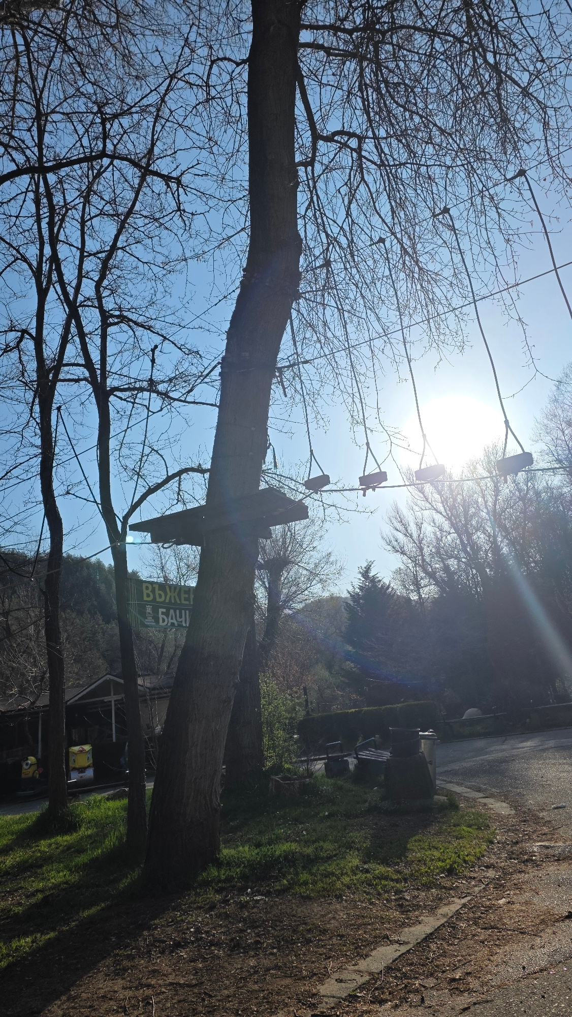The image depicts a scene at "Vazhe Batzi" rope park in Blagoevgrad, Bulgaria. The park appears to be located in a wooded area adjacent to a road or walkway. A tree with bare branches is prominent in…read more