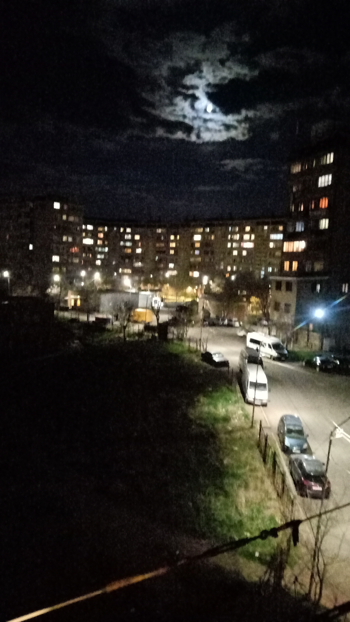 The image depicts a nighttime scene in Yerevan, Armenia, possibly taken from an elevated position overlooking a residential area. In the background, a large, curved apartment building is visible, with…read more
