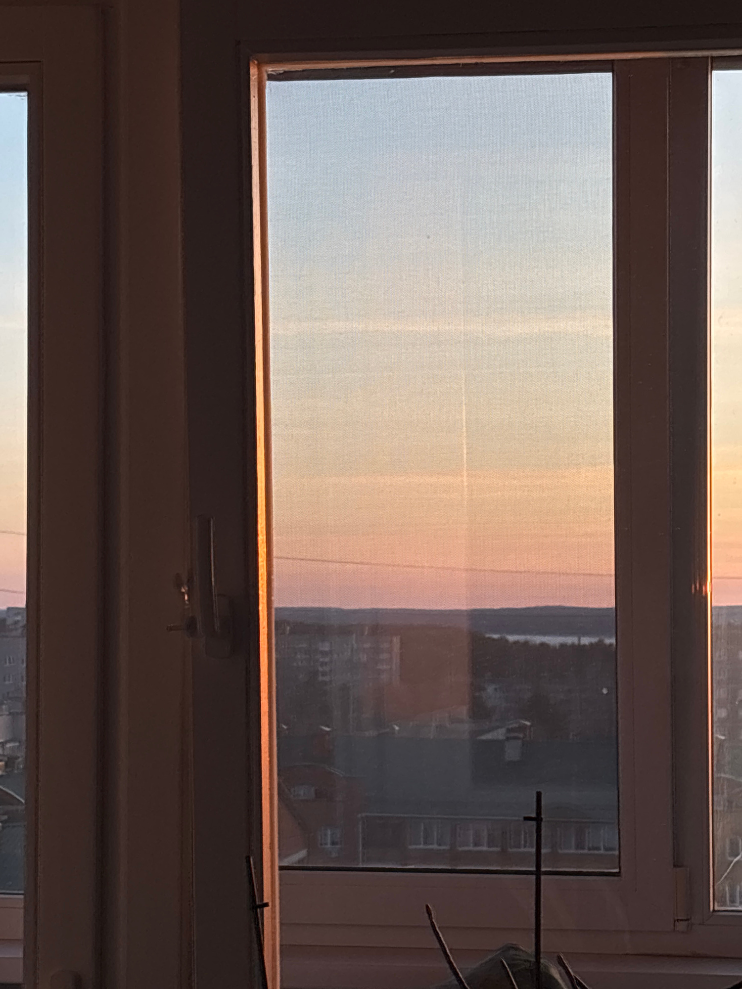The image depicts a view looking out of a window, which is covered by a translucent, textured screen or sheer curtain. The window frame appears to be white or light-colored, with a dark horizontal mul…read more