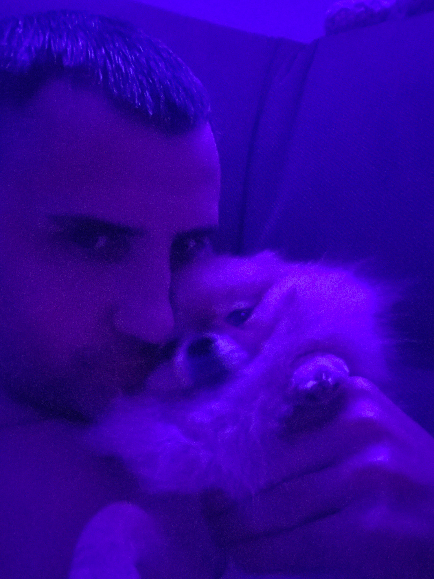 The image depicts a person lying down with a small, fluffy dog near their face. The scene is lit with a strong blue light, obscuring details. The person has short hair, and the dog appears to be a light-colored breed. The location is Unknown, Unknown. | Open Wire