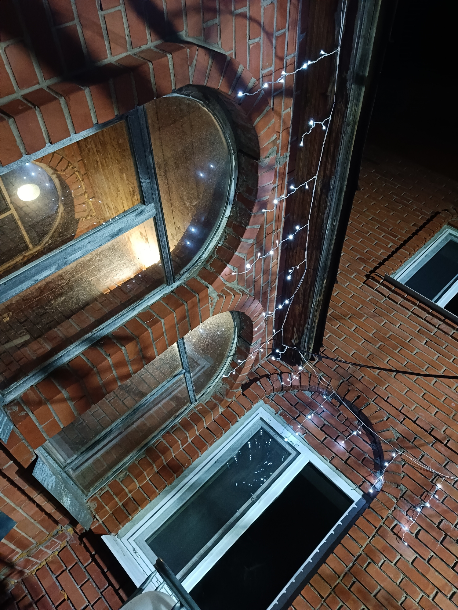 An upward-angled photograph of a building's red brick facade at night. Three windows are visible: two with rounded tops and a smaller rectangular one below. Christmas lights hang on the facade near th…read more