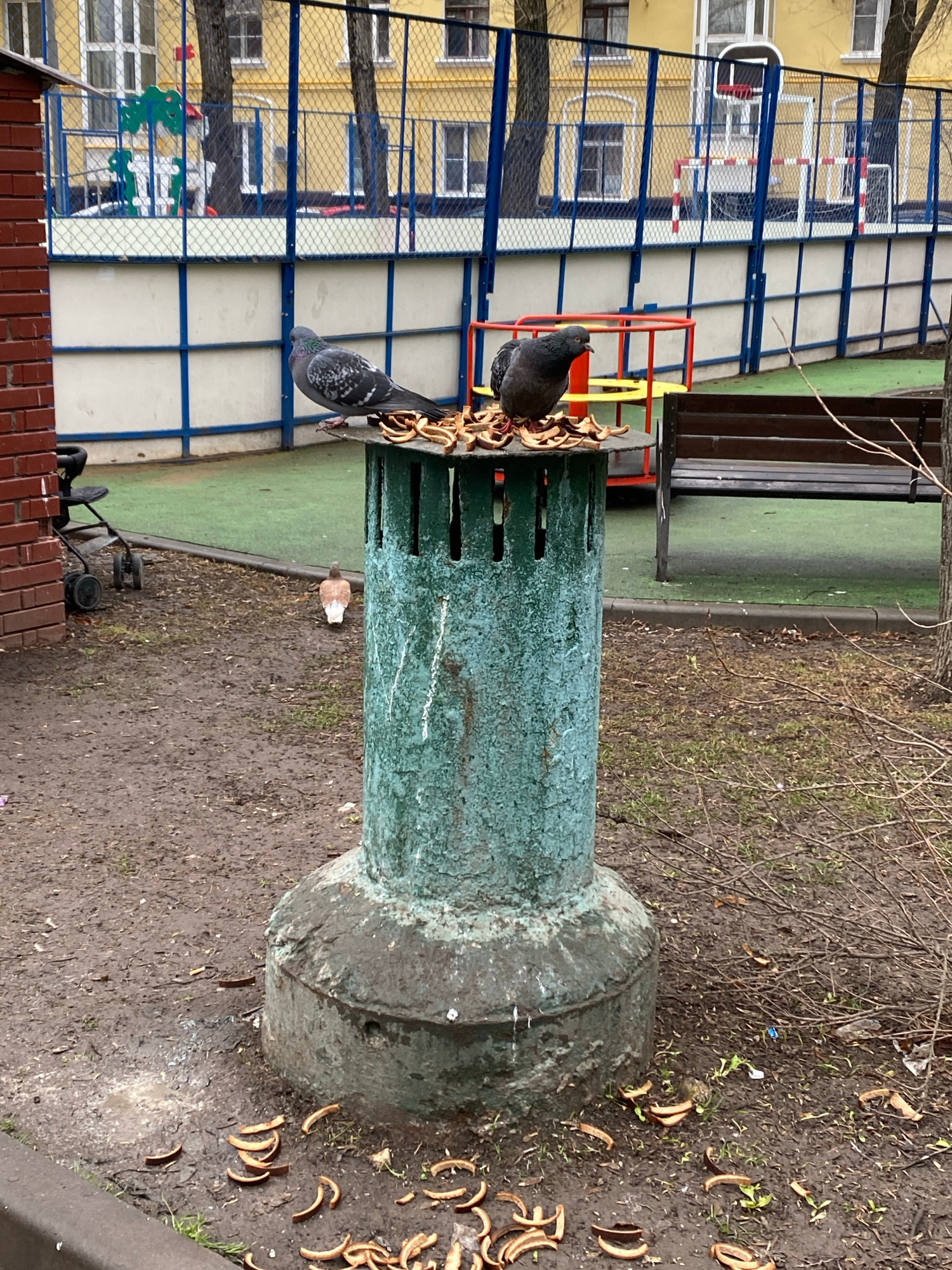The image shows an outdoor scene, likely a playground or park, in what appears to be a city setting. Two pigeons are perched on top of a moss-covered, cylindrical concrete structure with vertical slit…read more