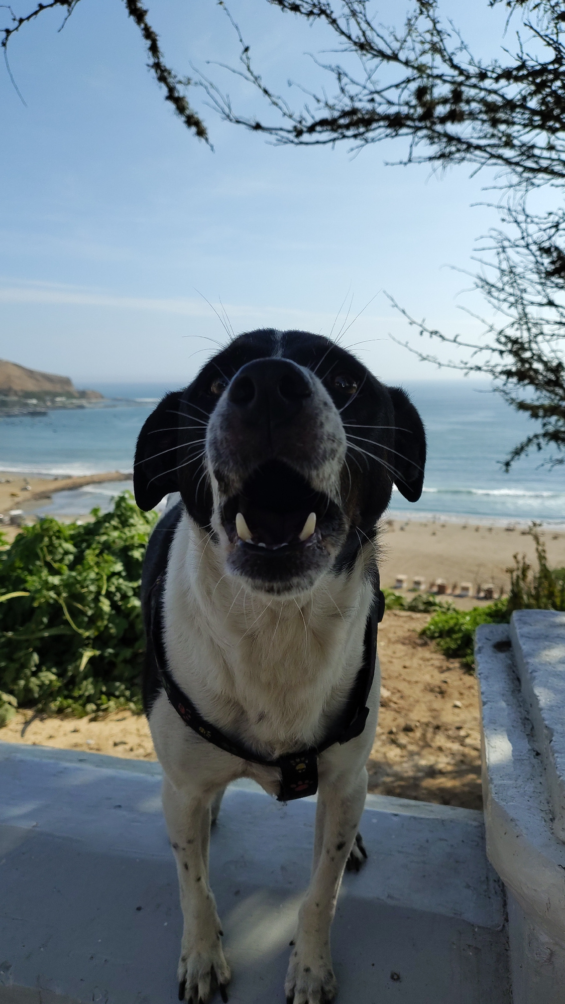 A dog with a black and white coat and black nose, wearing a harness, is the primary subject of the image. The dog is lying on a gray, concrete surface, possibly a ledge or step. Behind the dog is a vi…read more