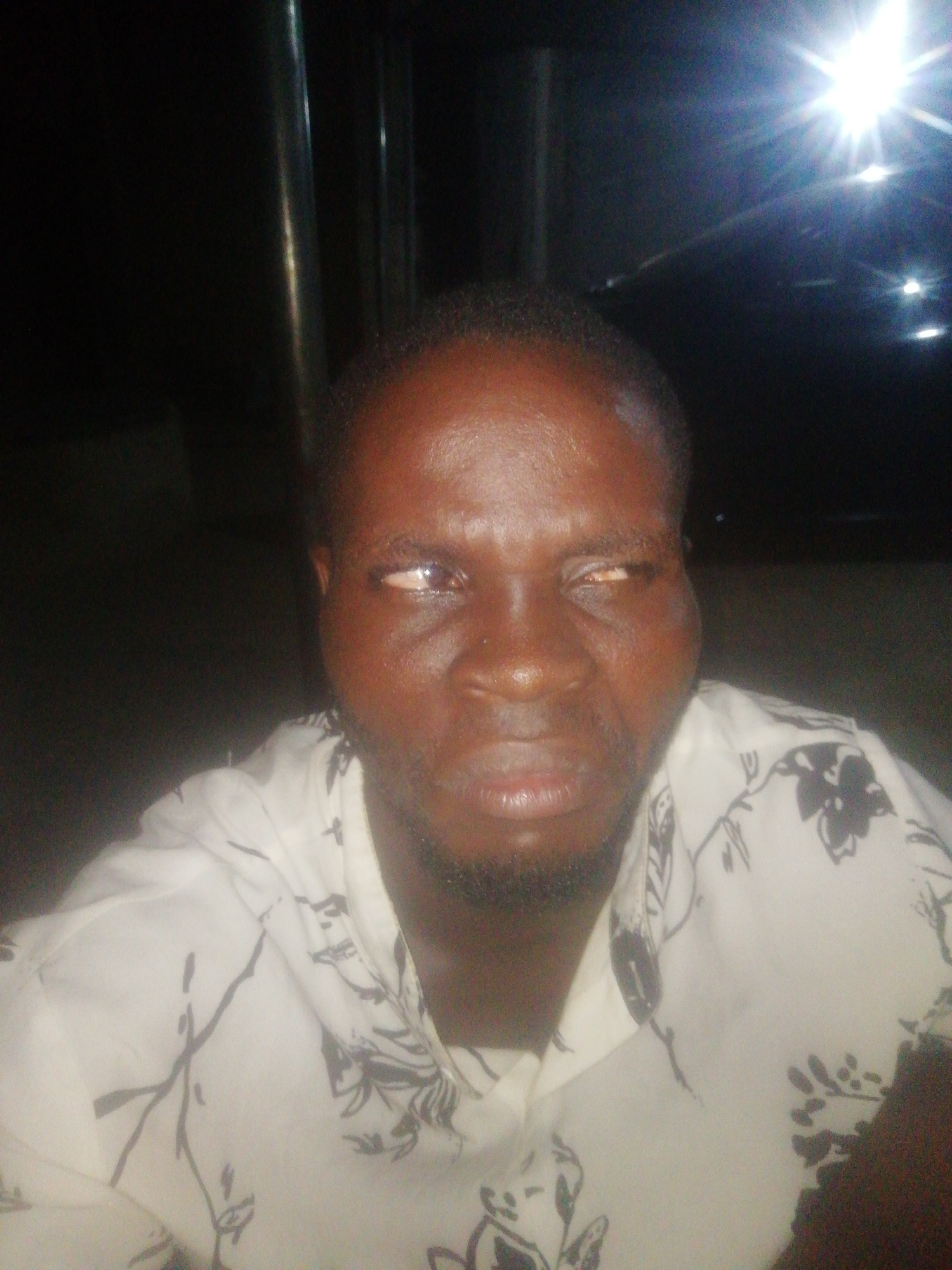 A dark-skinned man with close-cropped hair is centered in the frame. He is wearing a light-colored shirt with a dark floral pattern. His eyes are noticeably misaligned. The location is not evident.
