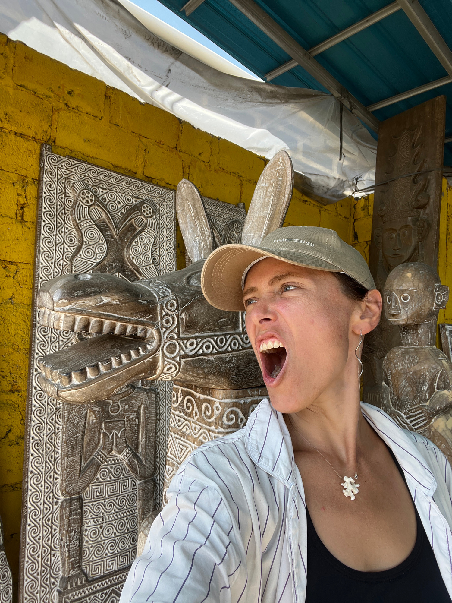 A female is positioned next to a large wooden carved animal sculpture attached to a yellow brick wall. The woman is wearing a striped white and light blue shirt over a black tank top, a tan baseball c…read more