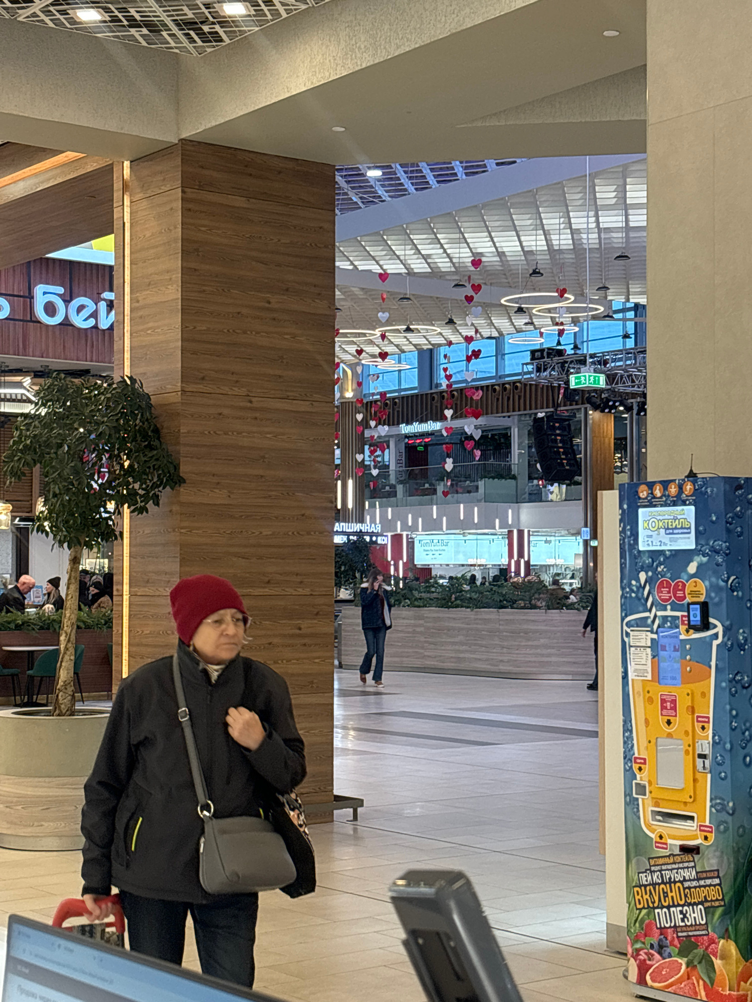 The image depicts the interior of a shopping mall, likely in Yekaterinburg, Russia. The scene is taken at an indoor location with wooden walls, artificial plants, and restaurant/cafe areas visible. In…read more