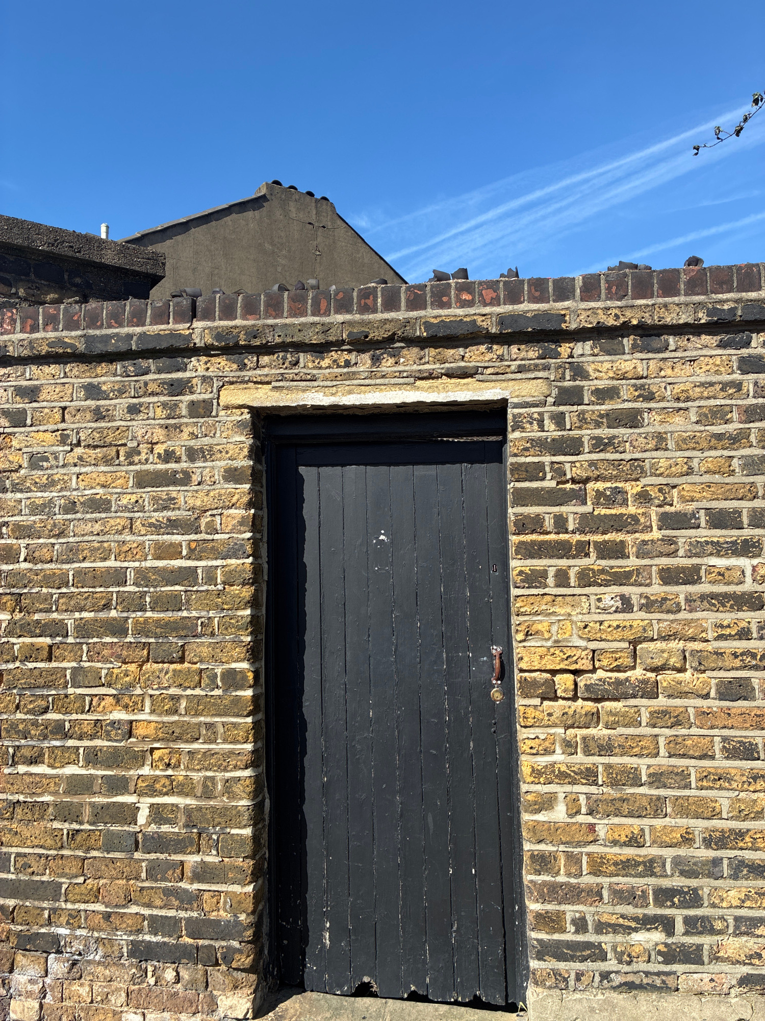 This image shows the exterior of a building, possibly a shed or small structure, constructed with yellow brick. A black door is set into the brick wall. The surrounding brickwork exhibits signs of wea…read more