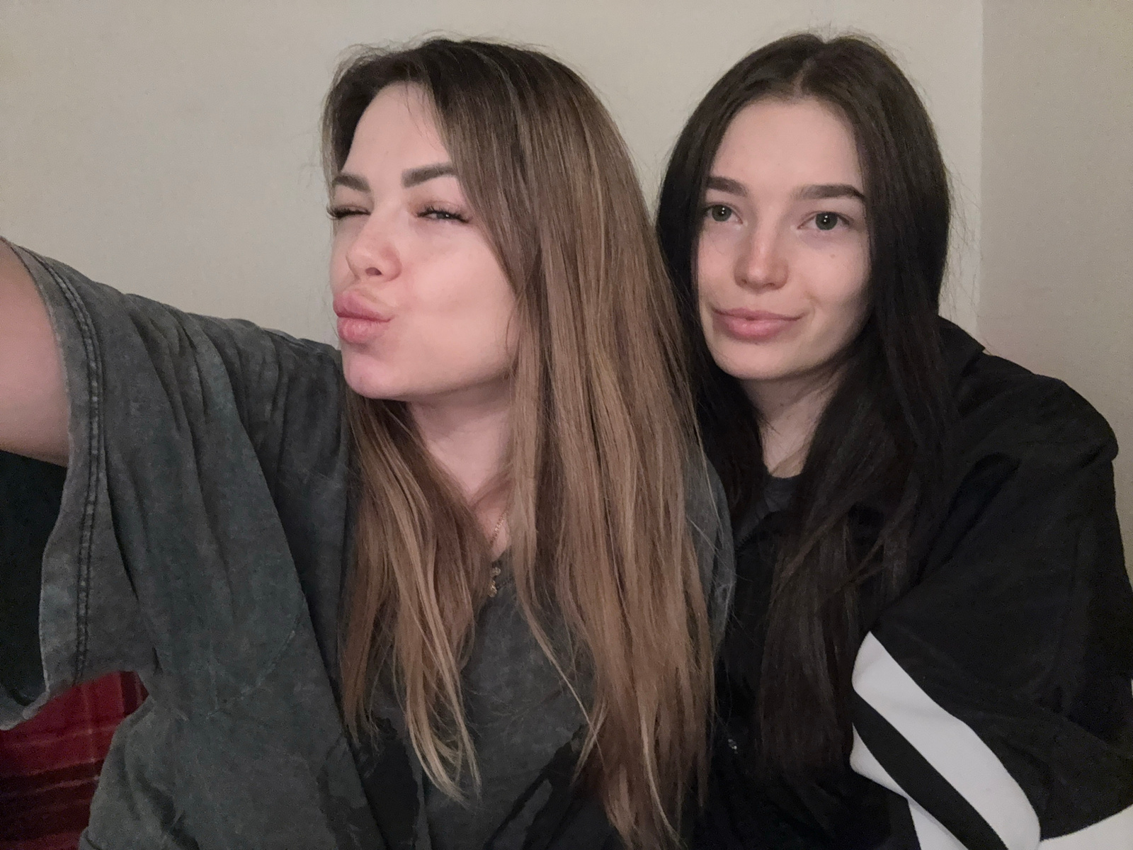 Two women are positioned side-by-side, their faces close together. The woman on the left has long, dark hair and is wearing a black jacket with white stripes on the sleeve. The woman on the right has…read more