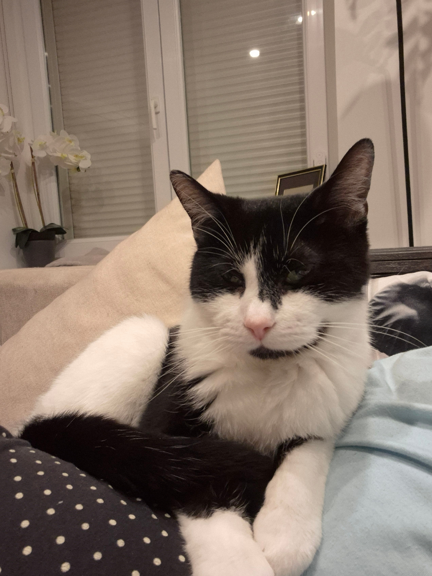 A black and white cat is lying on a pillow in front of a window. The cat has its eyes partially closed and appears relaxed. The background includes a window with blinds and a small potted plant with w…read more