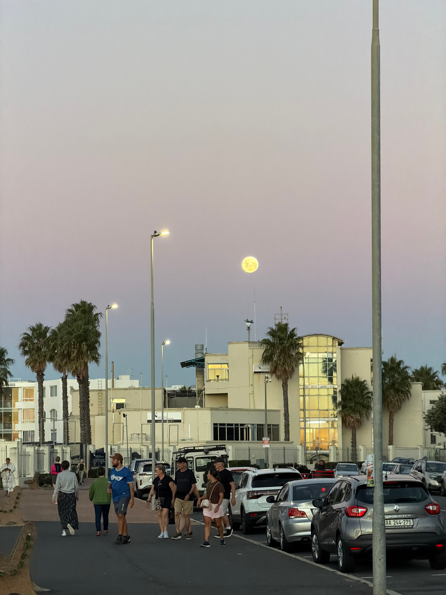 Captured in the city of Cape Town, South Africa, the image presents an evening scene featuring a full moon prominently in the sky. A row of palm trees lines the street, interspersed with street lamps.…read more