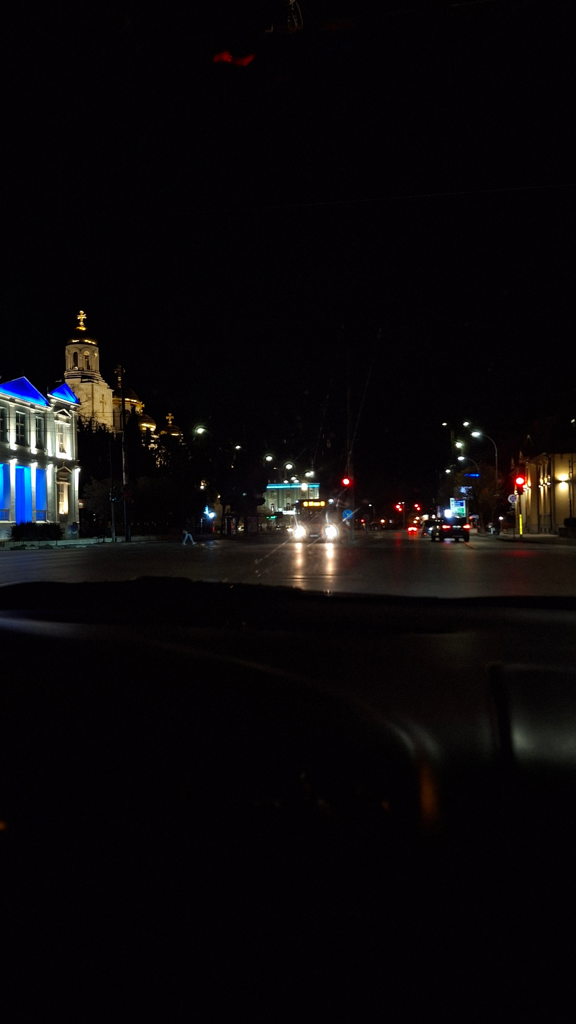 A nighttime scene shows a view through a vehicle windshield of the city of Varna, Bulgaria, from the perspective of someone driving. The street is dark, illuminated by street lights and building light…read more