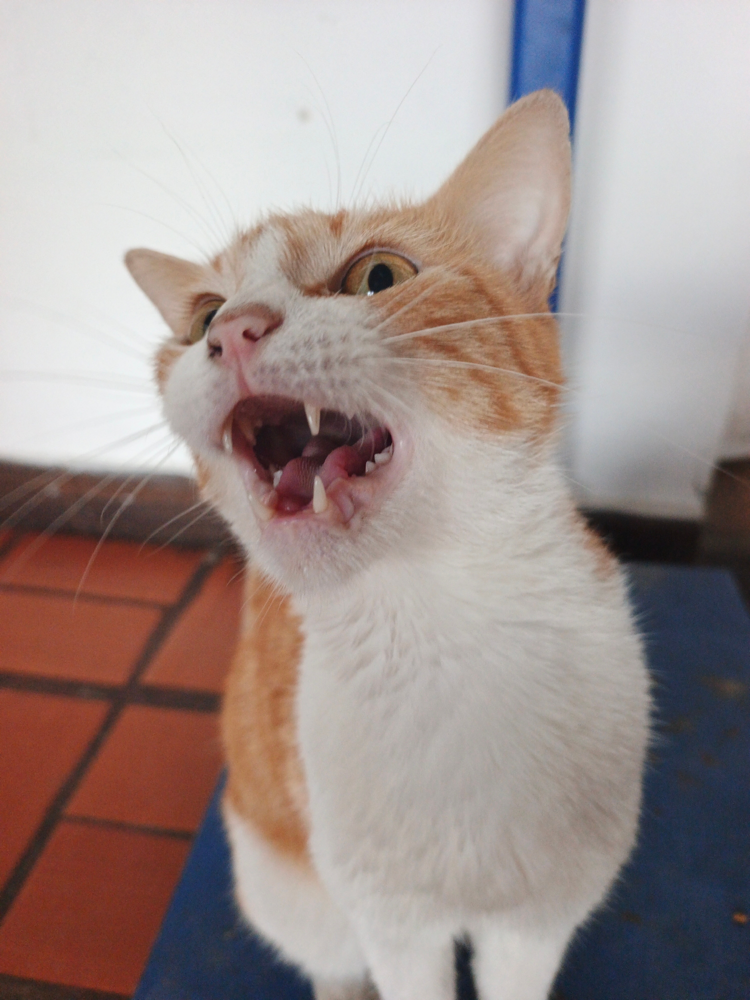 A close-up shot captures an orange and white cat in Tinaquillo, Venezuela, with its mouth wide open, revealing its teeth and tongue. The cat's eyes are visible, and its whiskers are prominent. The bac…read more