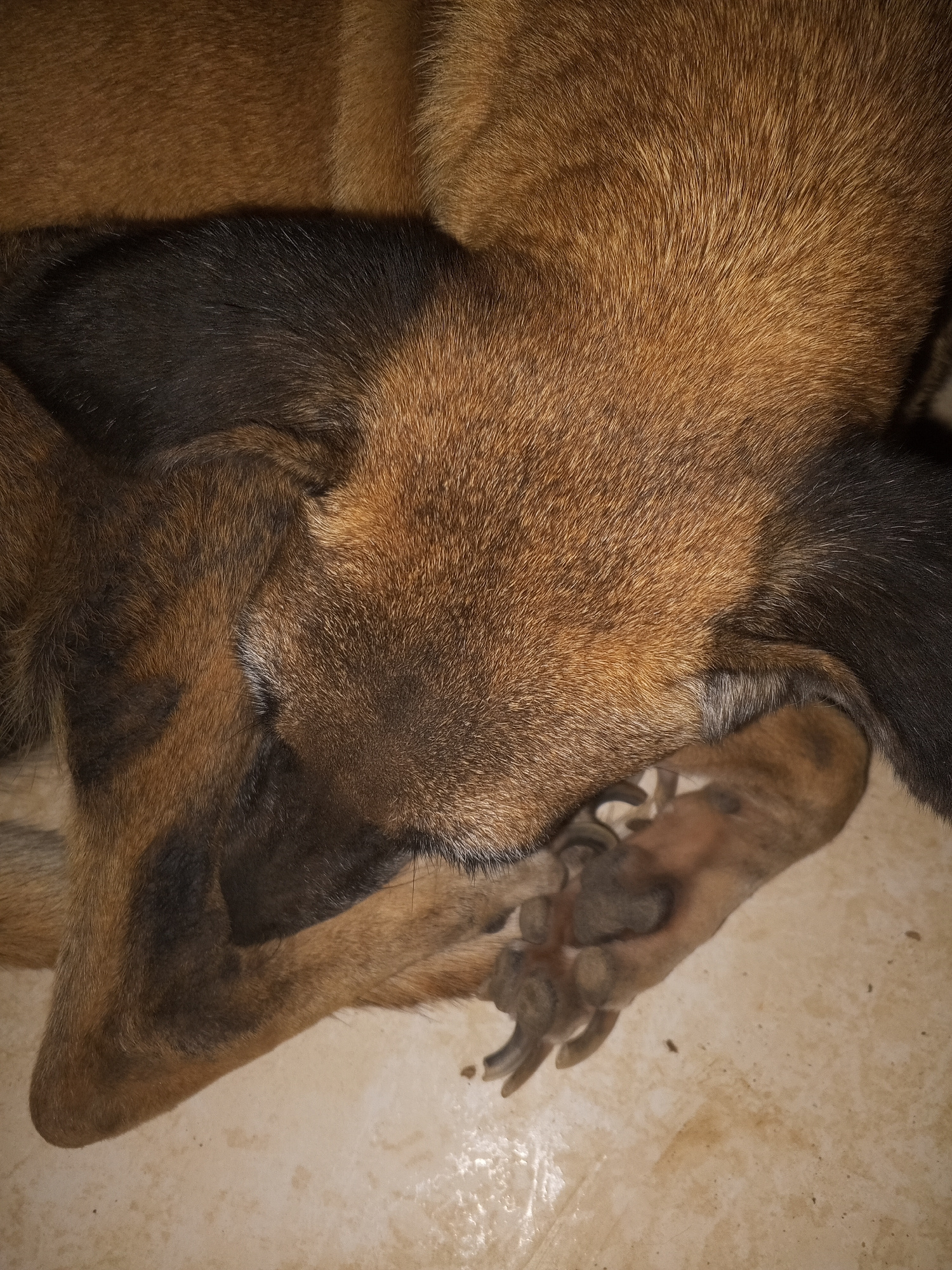 A tan and black shepherd dog lies on a tile floor, with several newborn puppies nestled near its foreleg. The scene suggests a domestic environment, possibly a residence in Juan Griego, Venezuela.