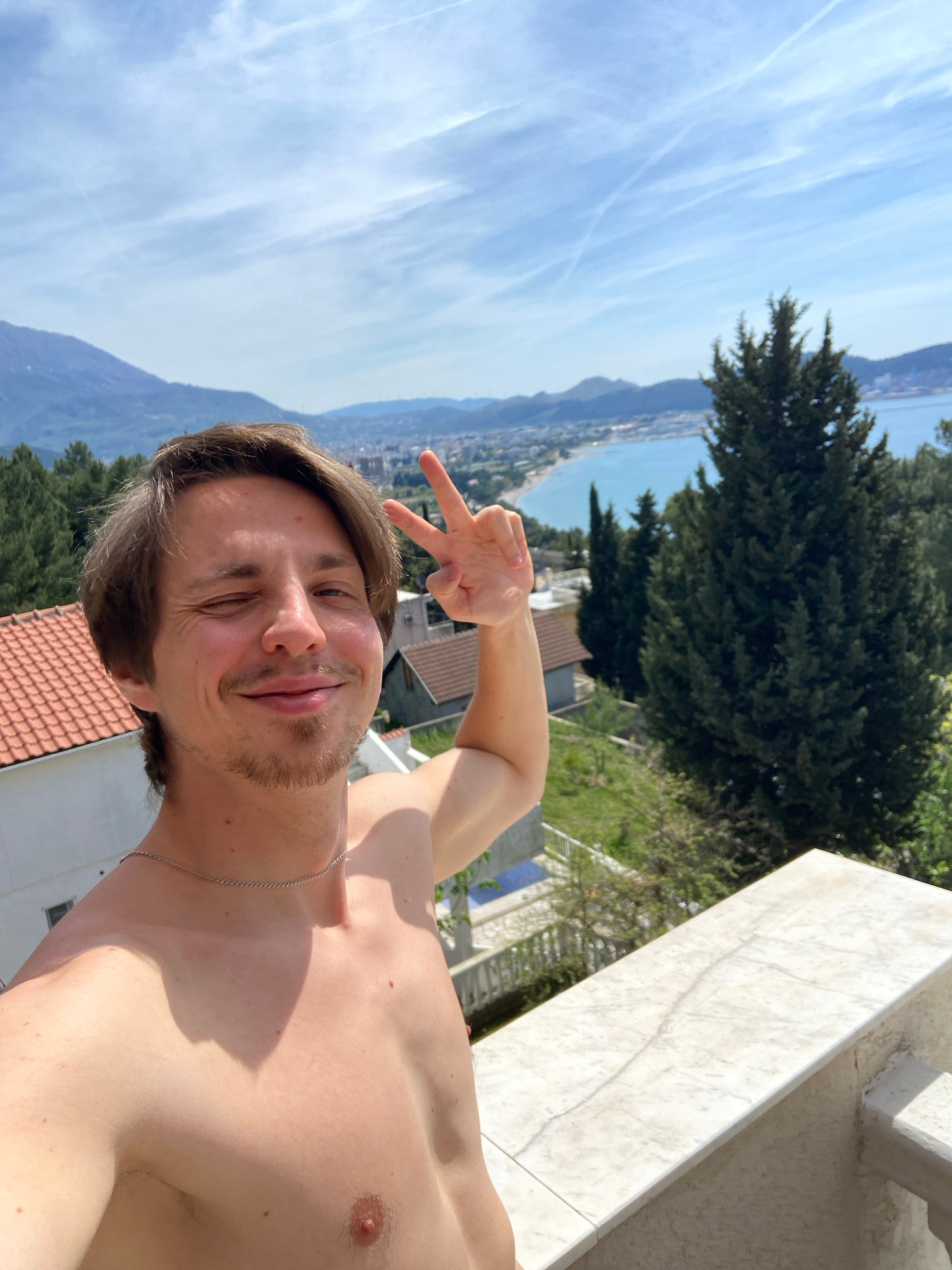 A shirtless man is facing the camera with a peace sign held up in his left hand. He has light brown hair and a short beard. He is standing on a balcony with a white marble railing. In the background,…read more