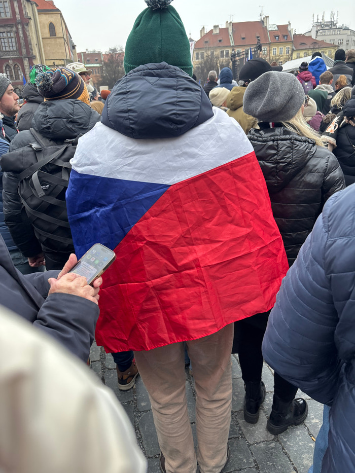 The scene depicts a dense outdoor public gathering in Prague's Old Town Square, Czechia, under an overcast sky. Historical buildings with gabled, red-tiled roofs and light-colored facades are visible…read more