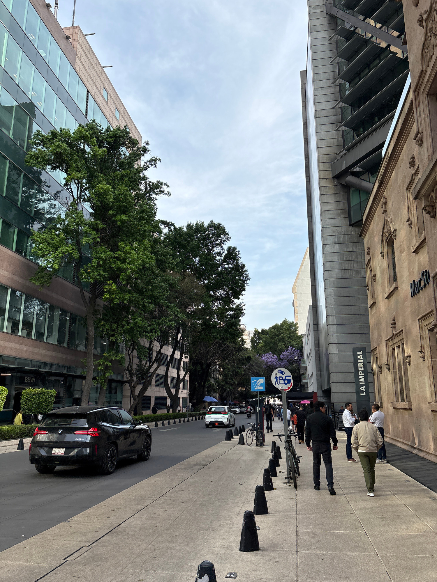 A street scene in Mexico City shows a busy sidewalk with pedestrians near the "La Imperial" building, identifiable by its signage. Cars are parked along the curb. Trees line the street. A sign depicti…read more