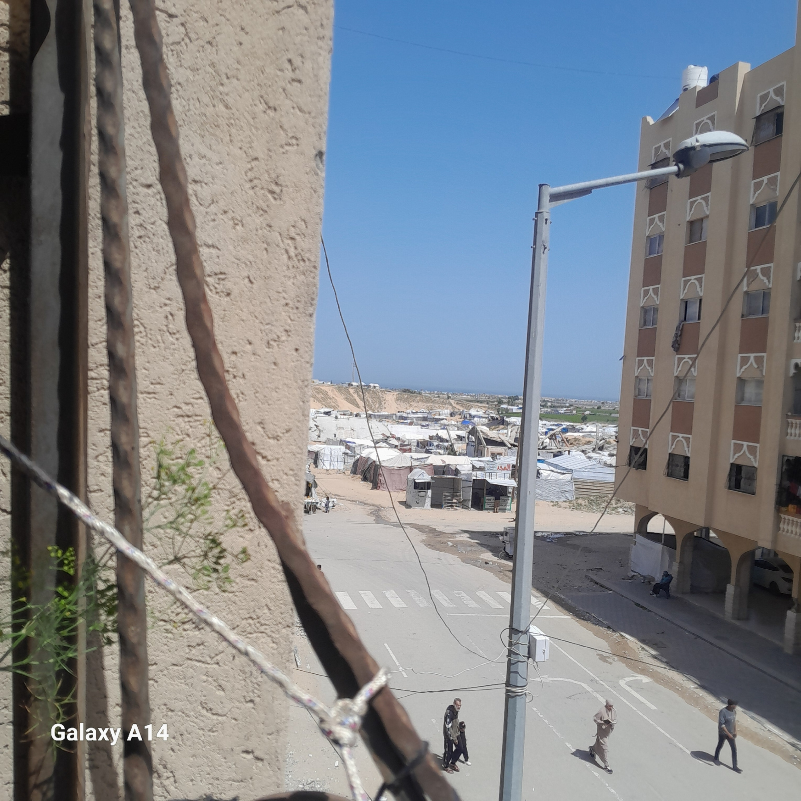 The image, taken from an elevated perspective, depicts a street scene in Khan Yunis, Palestinian Territory. **People:** Three individuals are visible walking on the street. Their attire suggests casu…read more