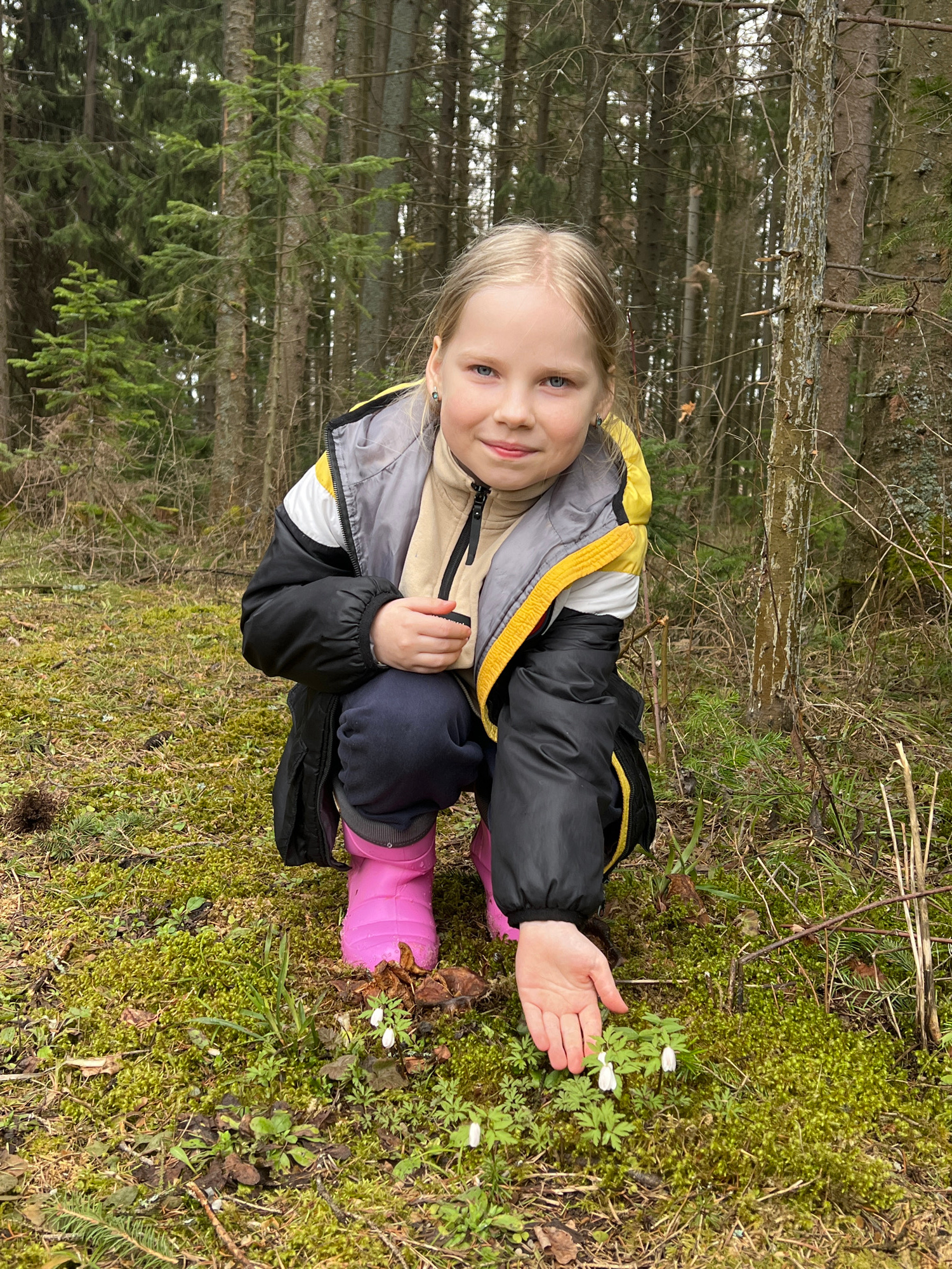 A young Caucasian girl with blonde hair, blue eyes, and fair skin is crouched in a forest environment. She wears a black and gray winter jacket with yellow accents, navy blue pants, and bright pink ru…read more
