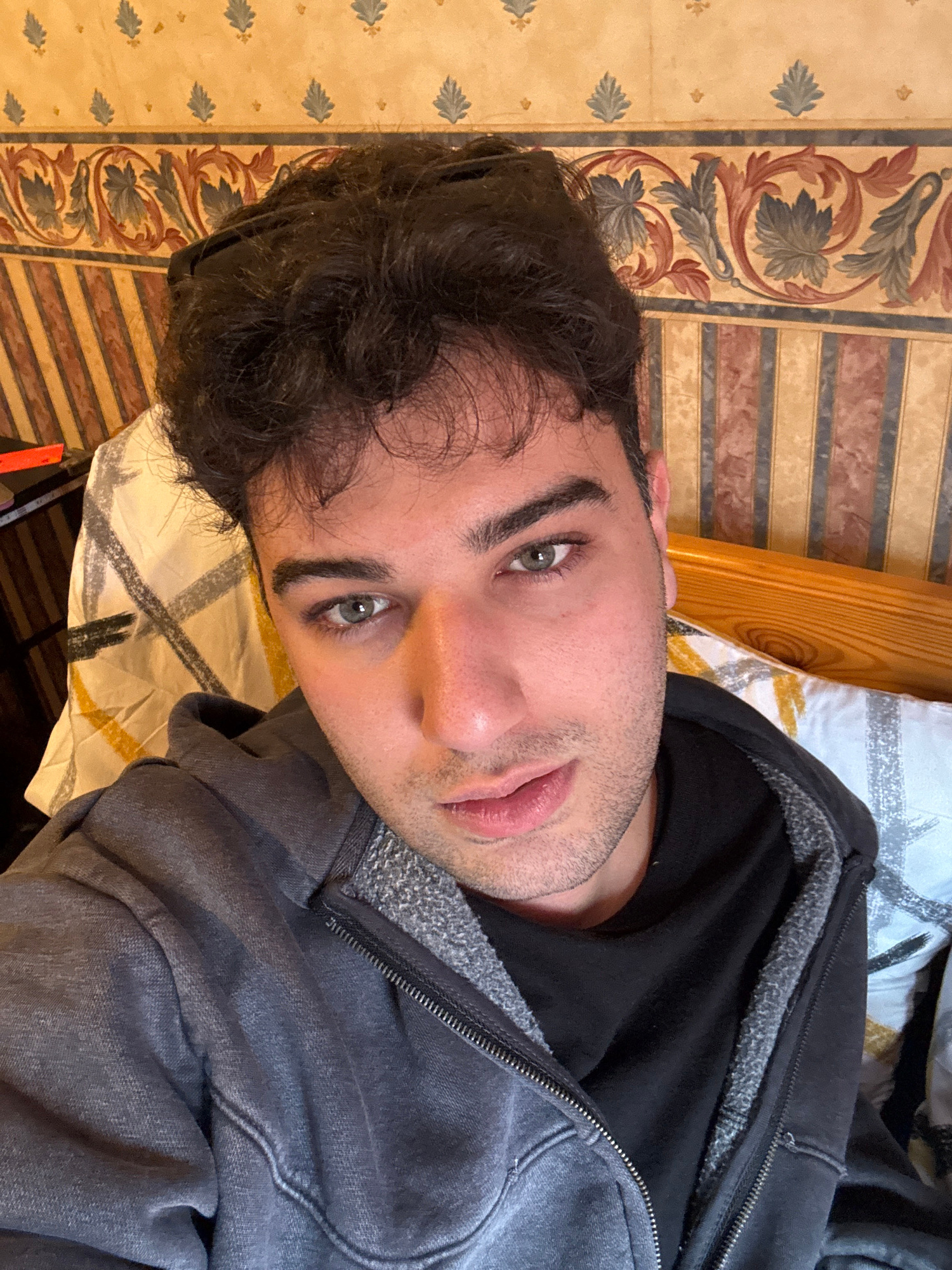 A male is lying in bed, wearing a grey hoodie over a black shirt. He has dark hair and green eyes. The bed has a patterned pillow. To the left of the bed is a wall with a decorative pattern. The locat…read more