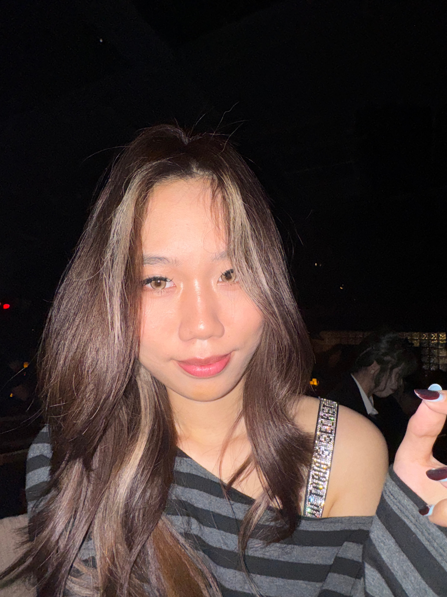 The image displays a young East Asian female in a dimly lit, nocturnal environment, located in Liangjiang, China. She occupies the left half of the frame, facing the camera with a subtle smile. Her lo…read more
