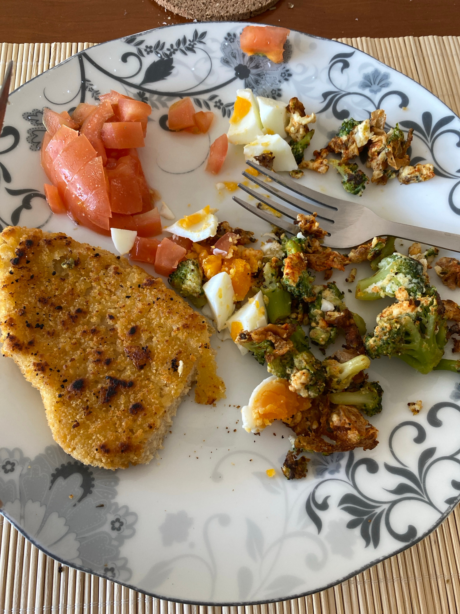 A plate of food rests on a textured placemat. The plate contains breaded food, chopped tomatoes, sliced hard-boiled eggs, and broccoli. A fork is positioned amongst the food.