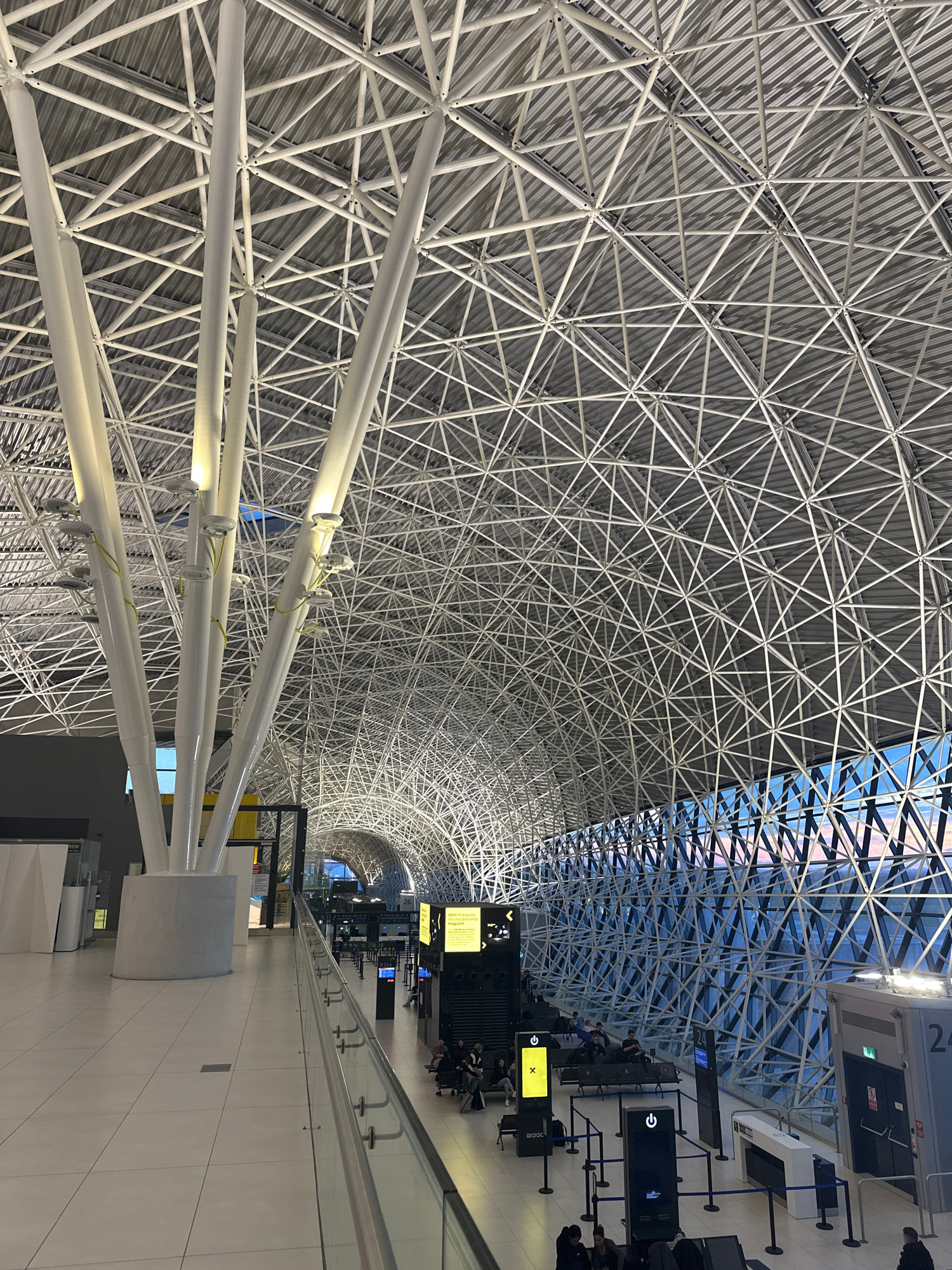 The image shows the interior of Zagreb Airport, located in City of Velika Gorica, Croatia. The architectural design features a prominent, intricate network of white metal beams forming the ceiling, cr…read more