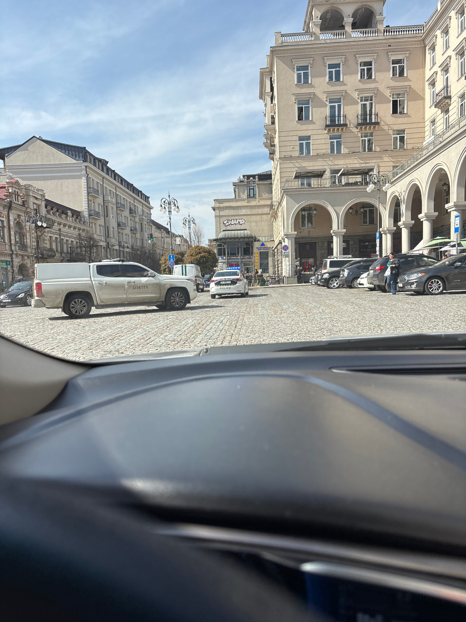 The image shows a street scene in Tbilisi, Georgia, as viewed from inside a vehicle. The street is paved with cobblestones, and buildings line both sides of the street. The buildings are old, with arc…read more
