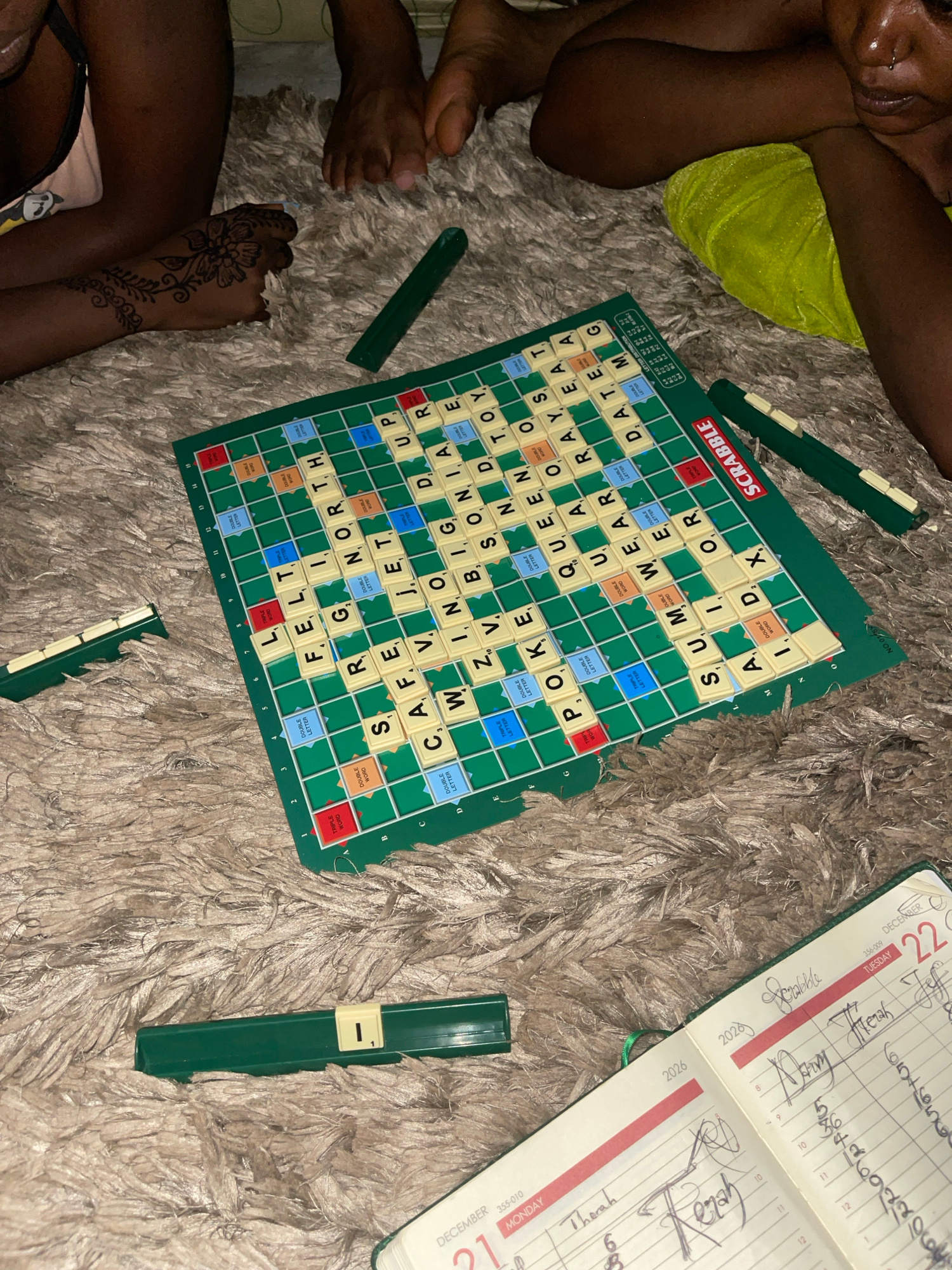 This media file captures a casual indoor scene in Kuchingoro, Nigeria, likely in the evening or at night, as suggested by the artificial lighting. The primary activity is a game of Scrabble, laid out…read more