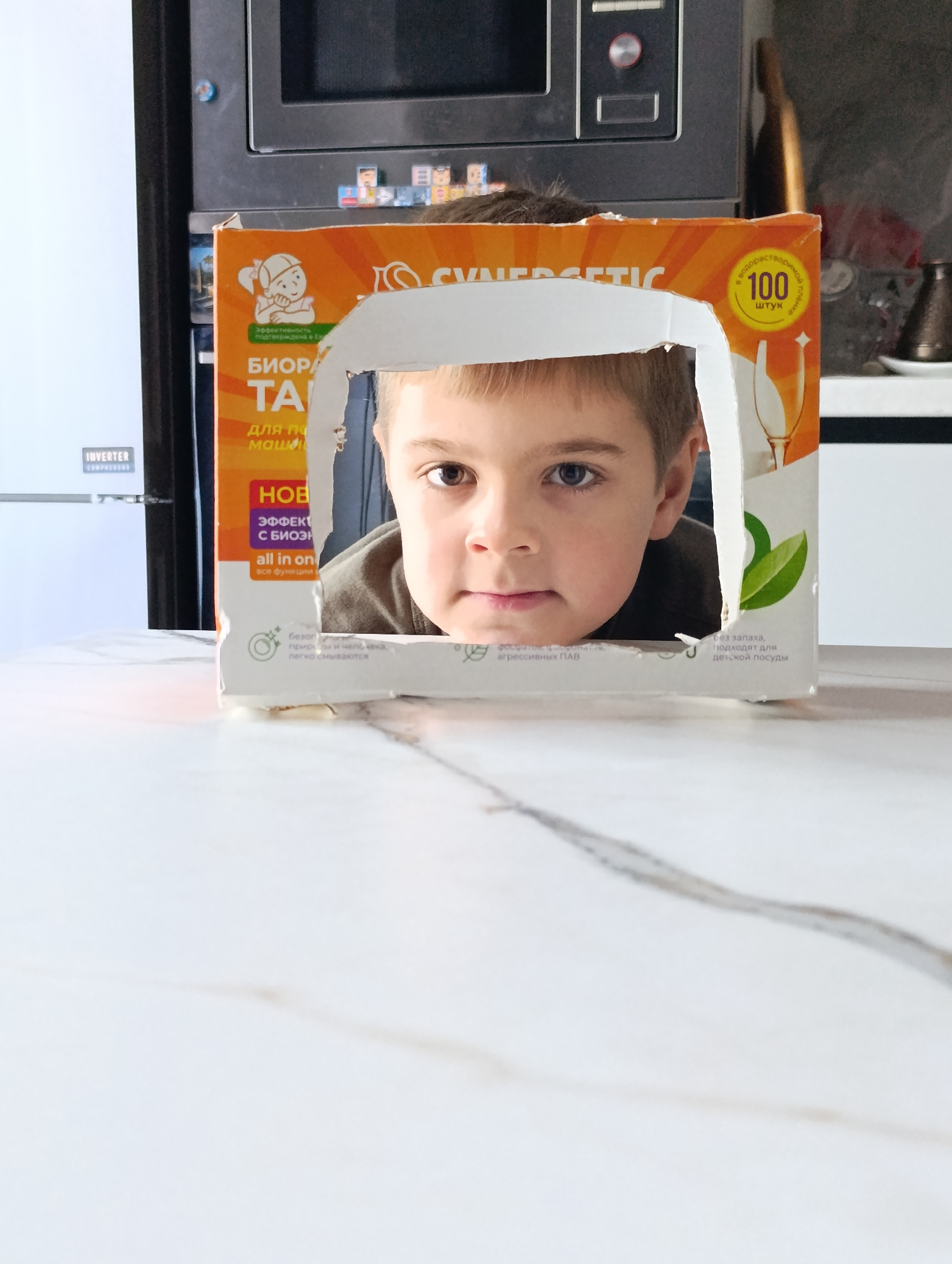 A young boy is peering through a hole cut in a cardboard box. The box has Russian text and images printed on it, indicating it likely contained a product. The boy's face is the main focus, framed by t…read more