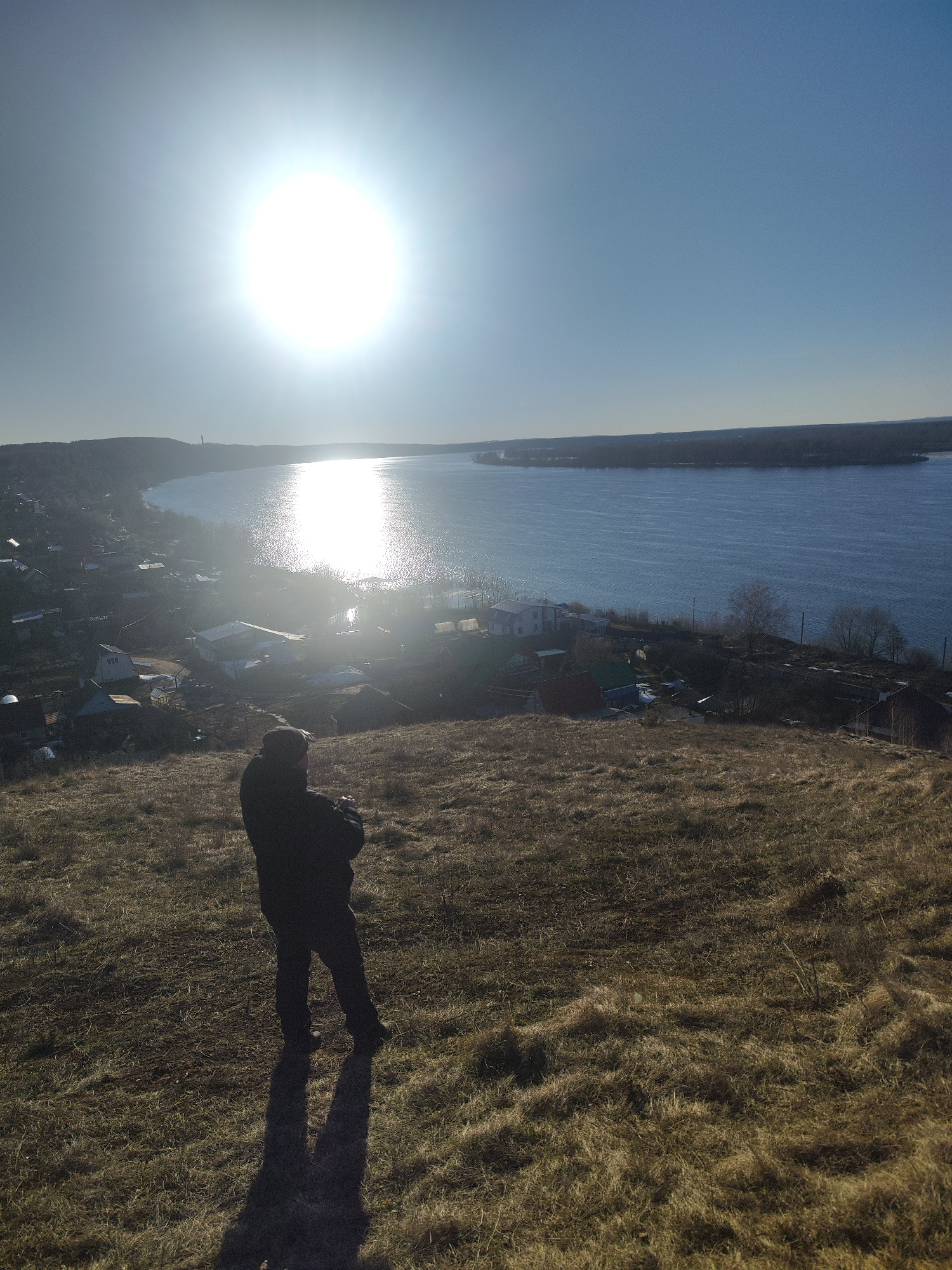A medium shot depicts a person standing on a grassy slope overlooking a river and a cityscape in Noviy, Russia. The person, clad in dark clothing, faces away from the camera with their arms crossed. T…read more