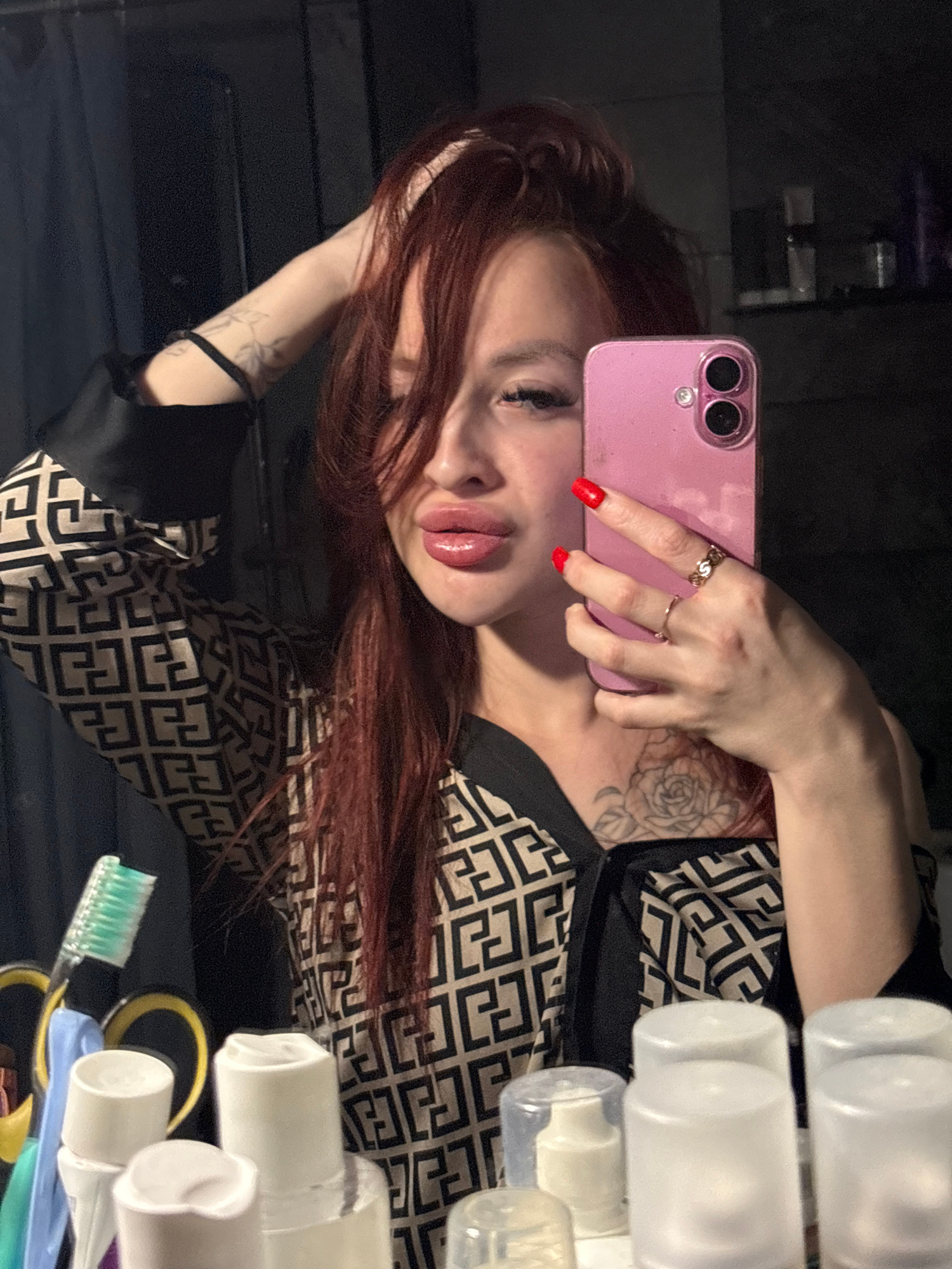 A person with red hair, red nails, and a rose tattoo on their neck is taking a selfie in a bathroom mirror. The person is wearing a black and beige patterned shirt. The person is holding a pink cell p…read more