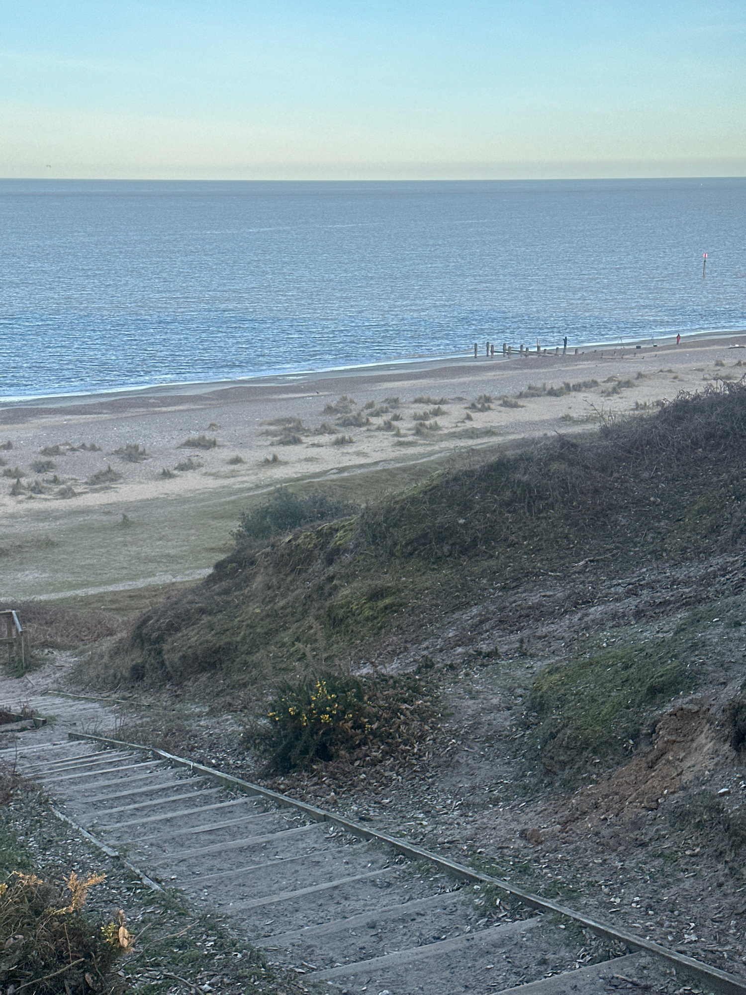 The image depicts a coastal scene, likely taken in East Suffolk, United Kingdom, given the geography and vegetation. A wide expanse of ocean occupies the left side of the frame, transitioning into a b…read more