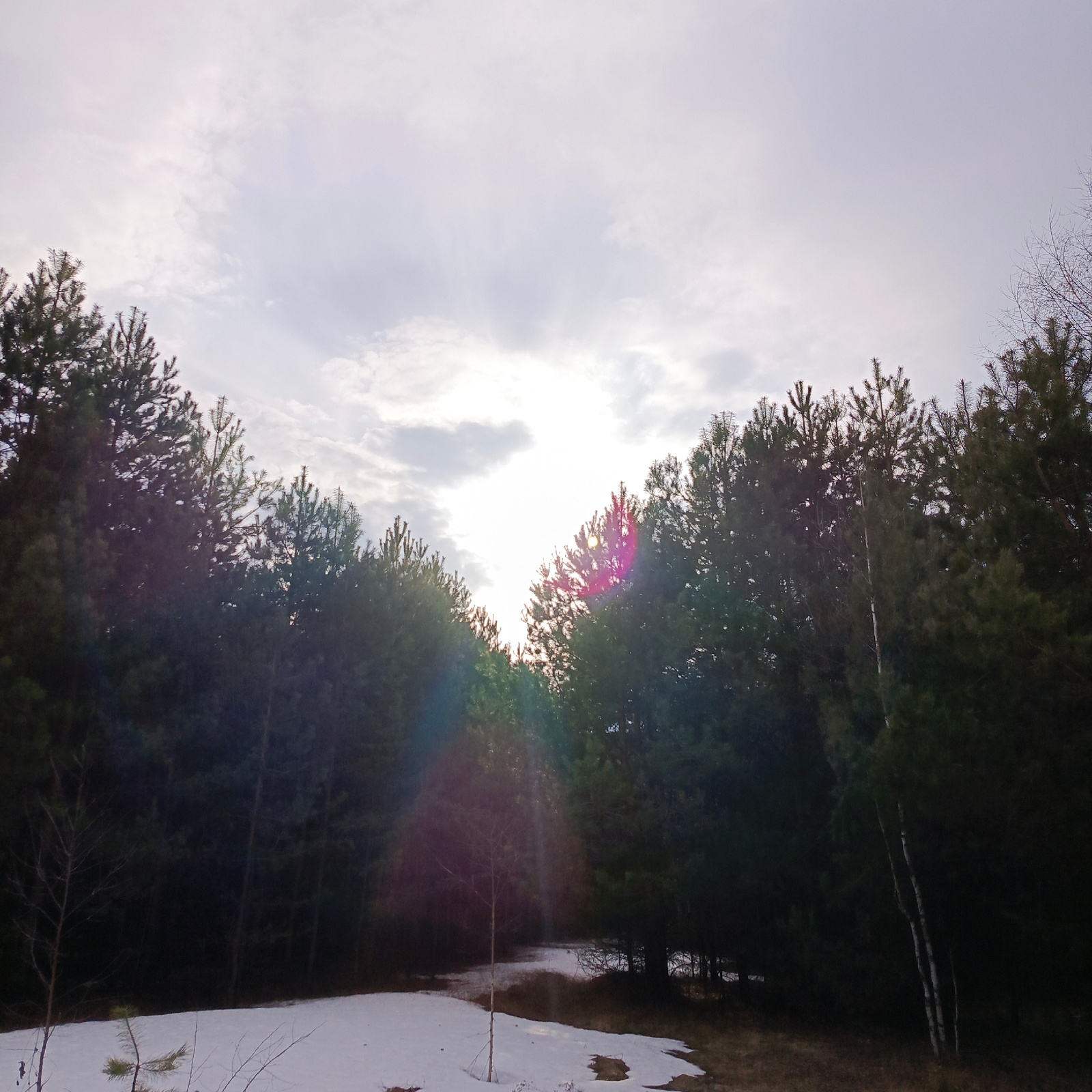 The image depicts a forest scene, likely located in Chaikovsky, Russia. The foreground shows melting snow patches on a ground covered with dry grass. A small sapling stands in the center of the snow p…read more