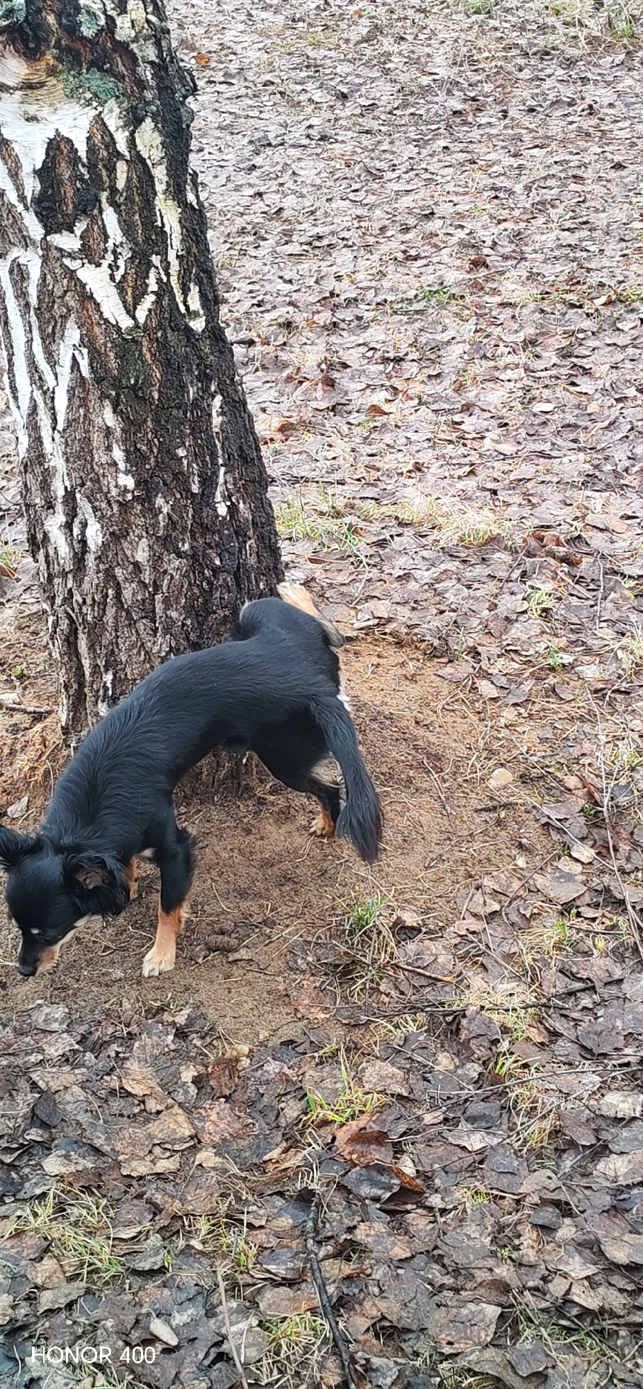 A medium-sized black dog with tan markings on its paws and tail is sniffing the ground near the base of a birch tree. The tree's trunk is predominantly white with dark, vertical markings. The ground i…read more