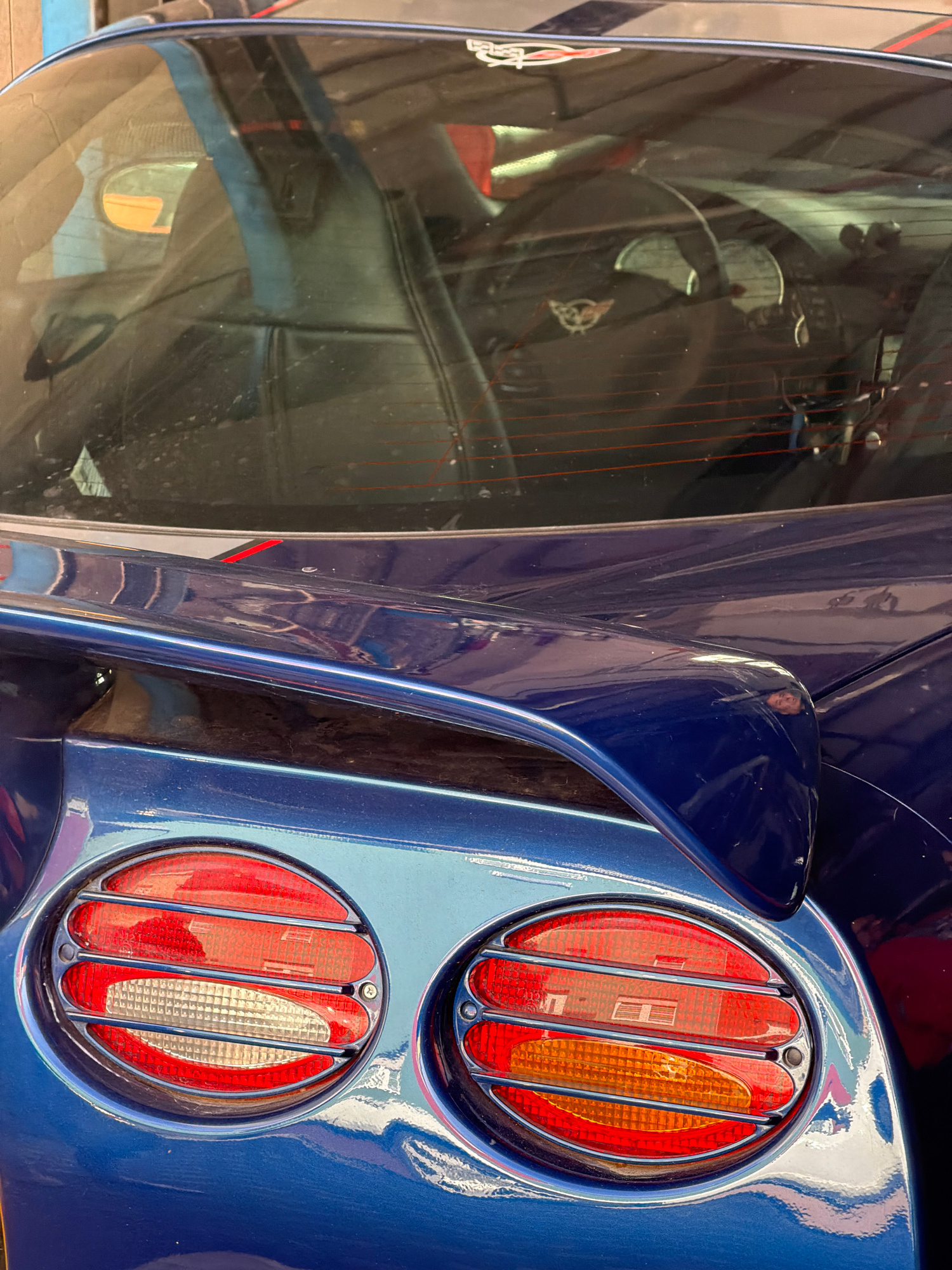 The image provides a close-up view of the rear-right section of a glossy blue car, likely a sports or classic model, within an indoor setting such as a garage or showroom in Tétange, Luxembourg. The…read more