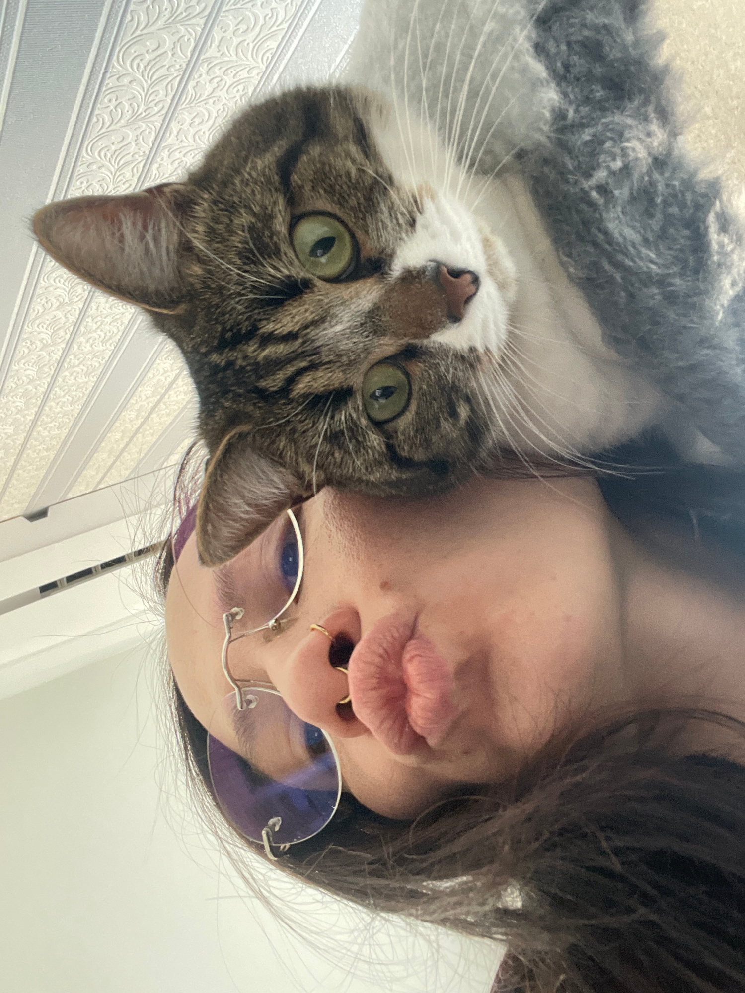 A selfie shows a person with dark hair, round glasses, and a nose ring positioned above and beside a cat. The person is making a kissing face. The cat is gray and white with green eyes. The background…read more