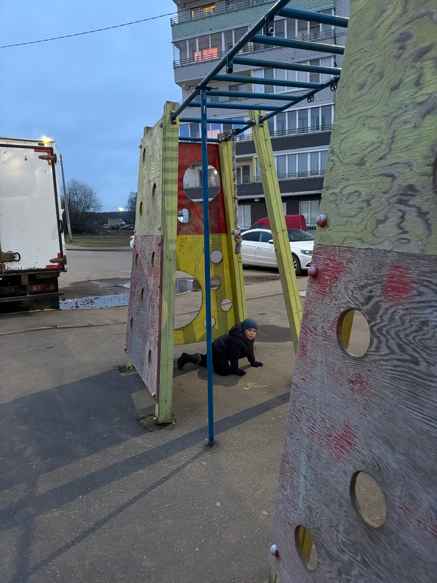 This media file captures an outdoor scene featuring a child near a colorful playground structure in what appears to be an urban or semi-urban setting in Chaikovsky, Russia. The primary subject is a y…read more