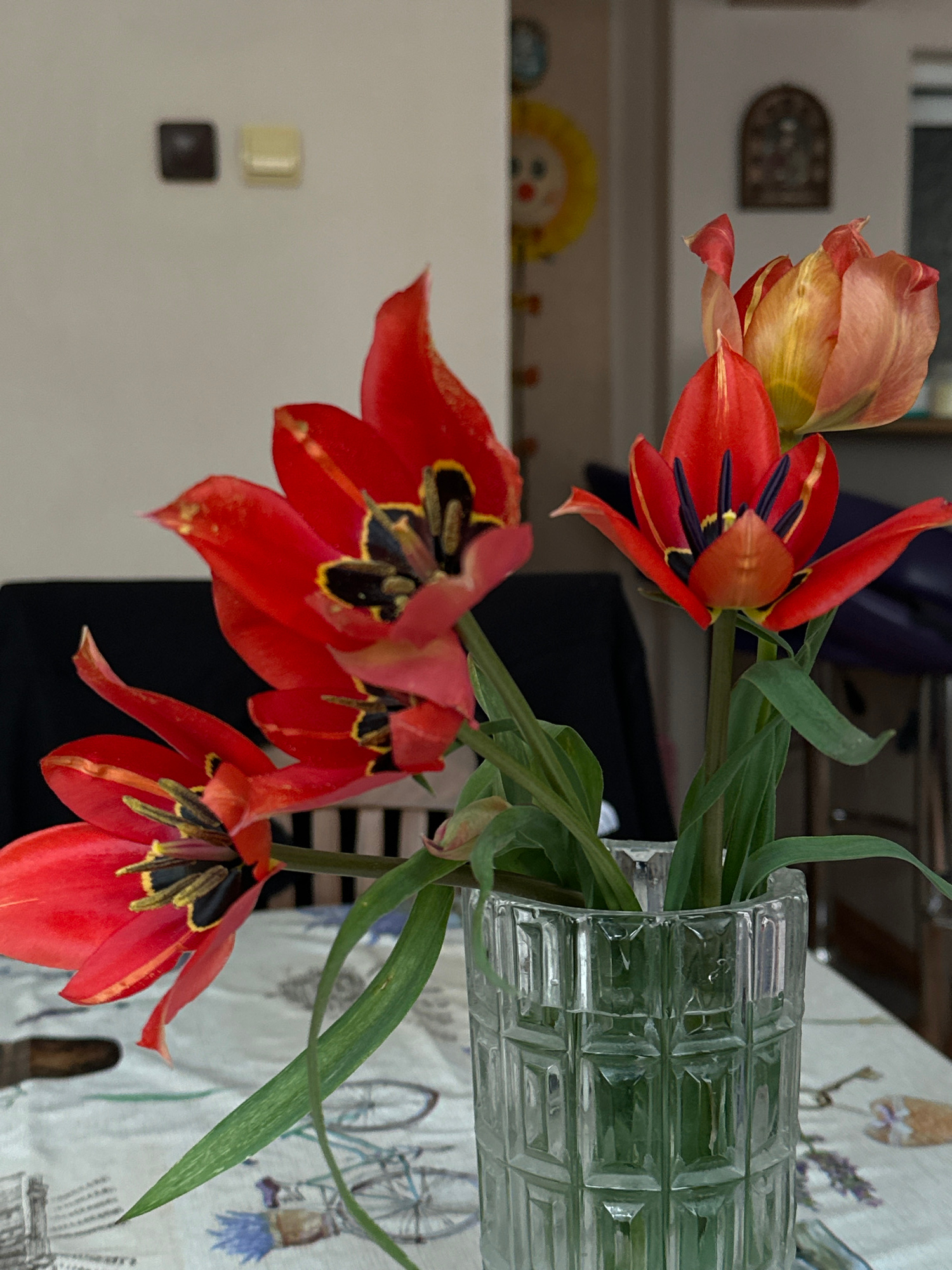 The image depicts a still life scene within a domestic interior in Stara Zagora, Bulgaria. Centrally positioned is a bouquet of approximately five tulips arranged in a clear glass vase featuring a tex…read more