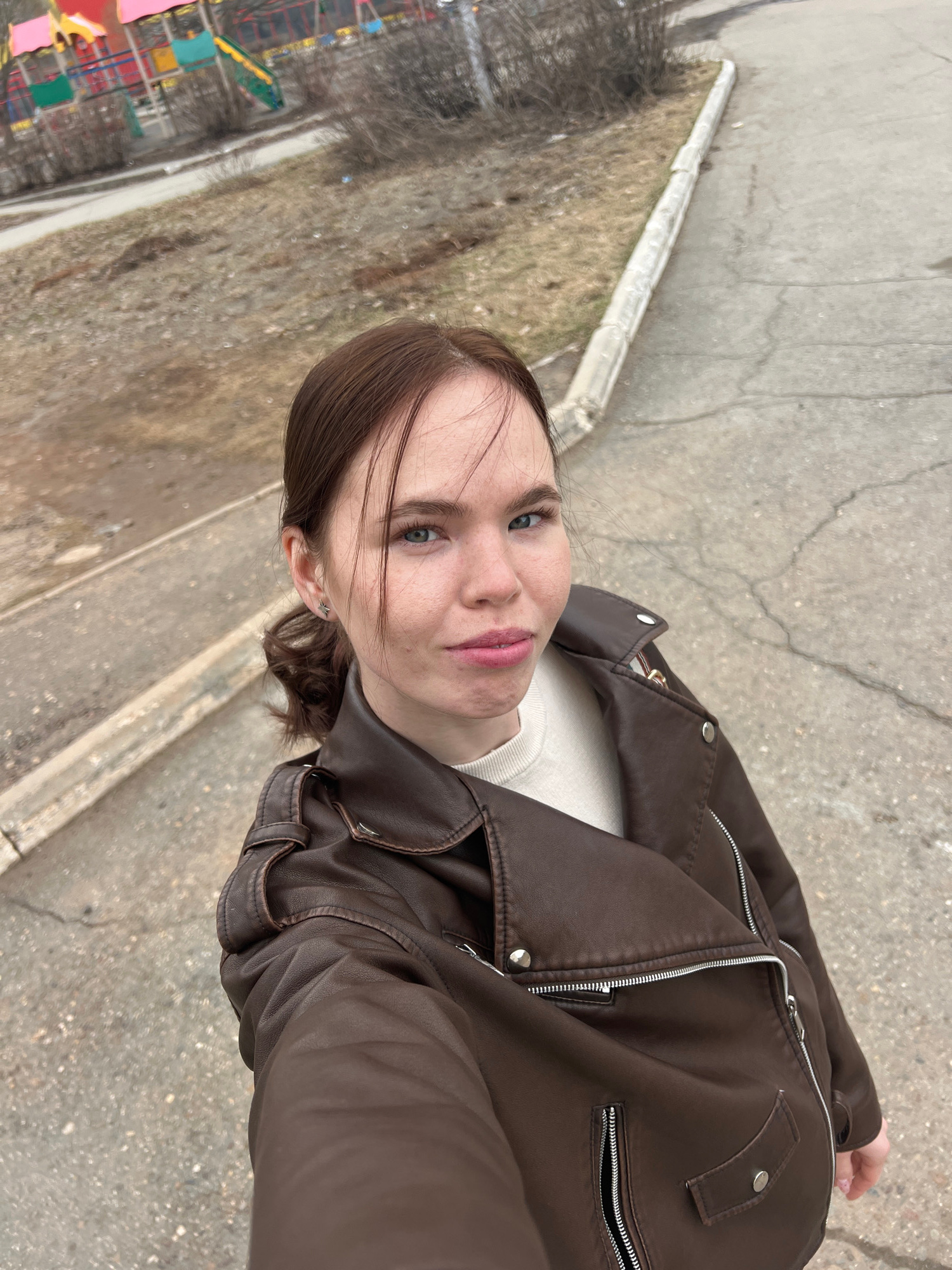 A medium, low-angle shot of a young woman with light skin, brown hair, and blue eyes, facing the camera. She wears a brown leather jacket over a light-colored top. The background consists of a concre…read more