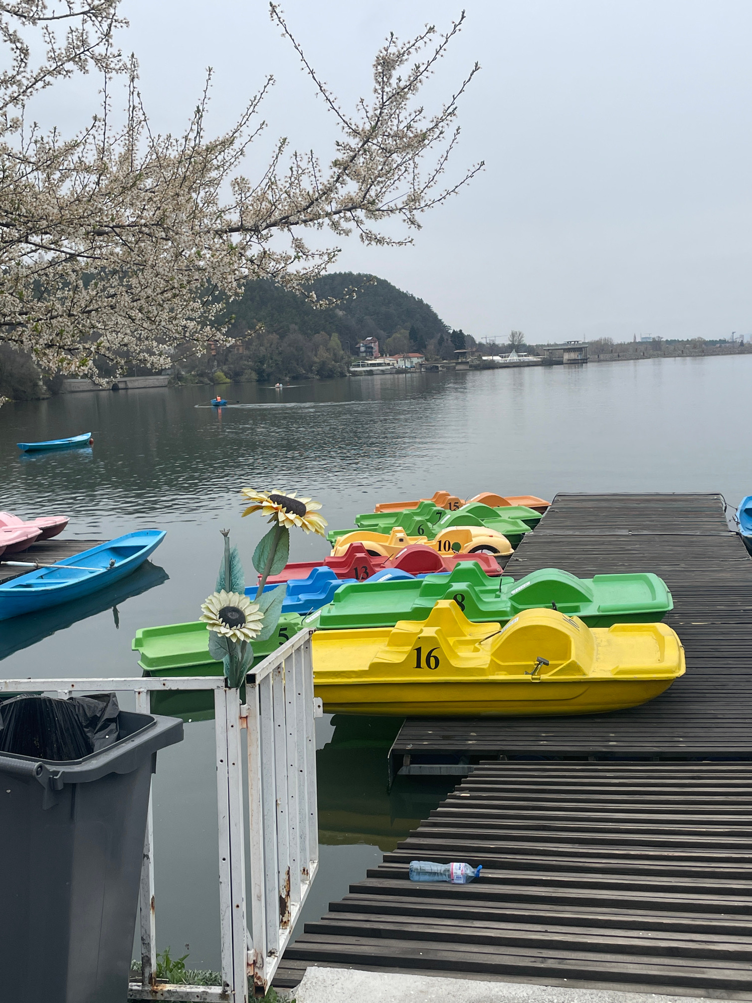 The image depicts a scene on Lake Pancharevo, located near the village of Pancharevo, Bulgaria. A wooden dock extends over the water, alongside which are several colorful paddle boats, including yello…read more